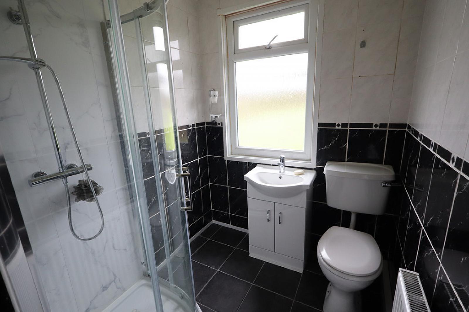 SHOWER ROOM Shower unit with thermostatically controlled shower, rainwater effect shower head, glazed shower screen, wall panelling, wall tiling, vanity sink unit, low flush W/C, extractor fan