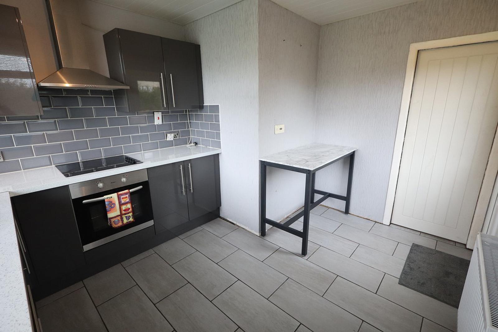 MODERN KITCHEN 11' 10" x 9' 10" (3.61m x 3m) Modern kitchen with a range of high and low level units, stainless steel oven, inlaid hob, stainless steel extractor fan, ceramic tiled flooring, panelled ceiling, uPVC back door