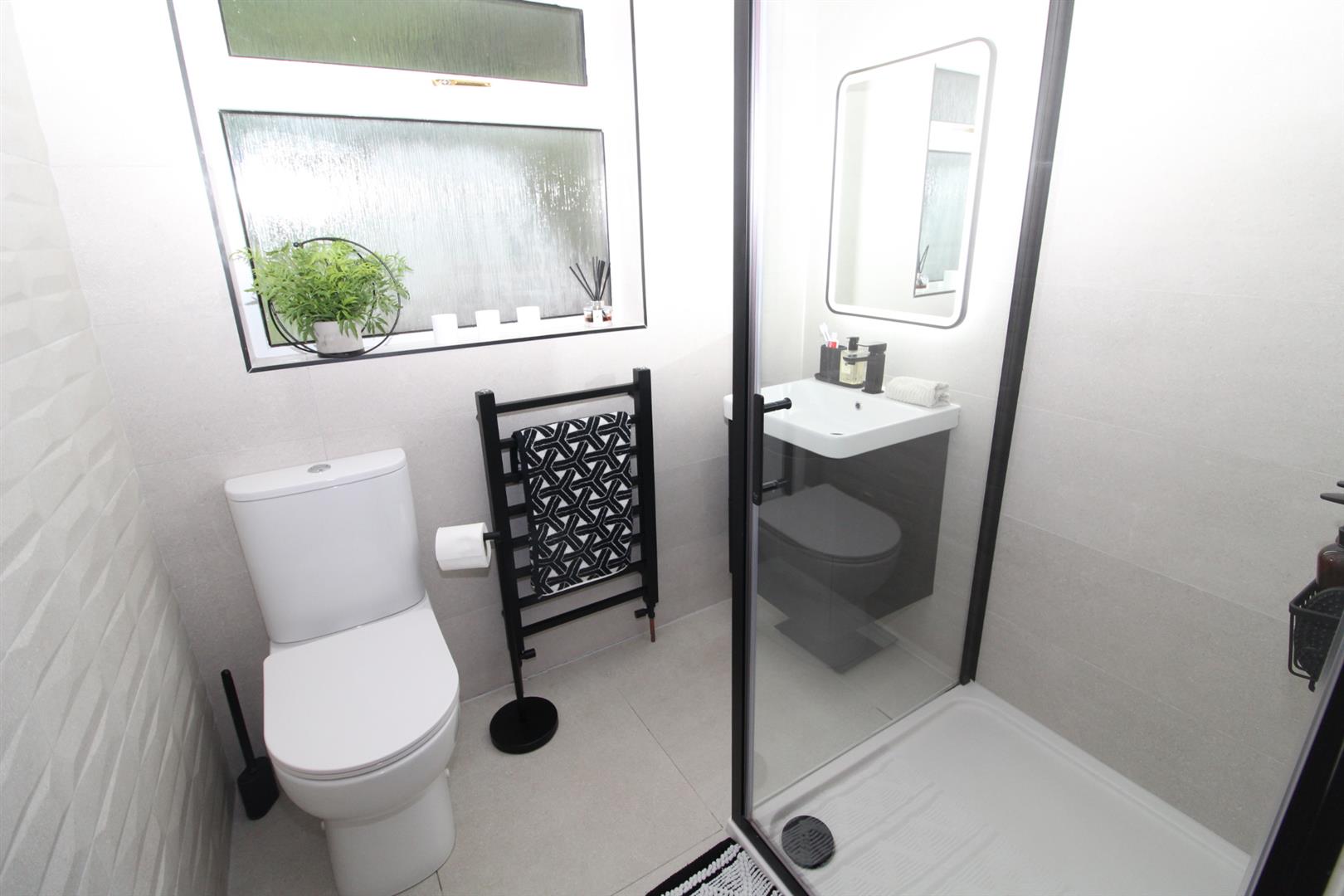 Glazed shower cubicle with feature rainfall shower and separate handheld shower, low flush, vanity unit sink, heated towel rail, wall tiling, ceramic tiled flooring, PVC panelled ceiling, downlighters, extractor fan