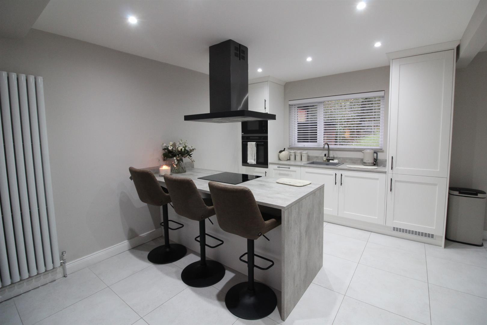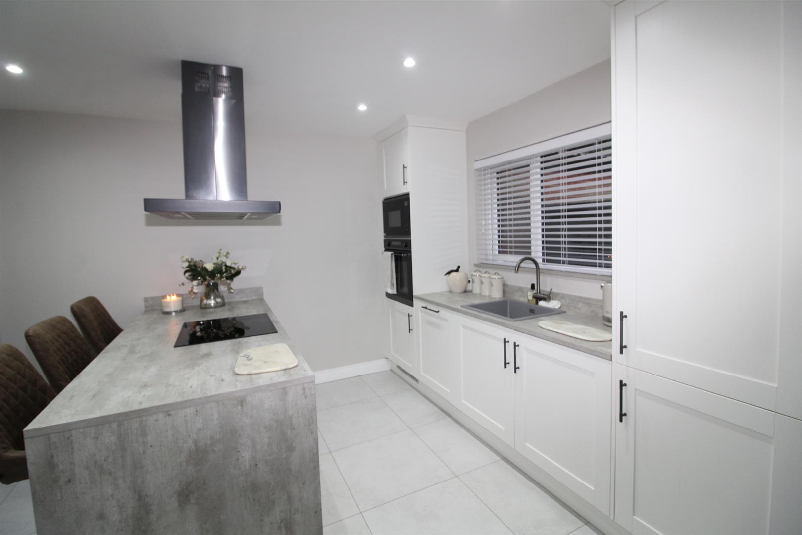 Range of high and low level shaker style units, round edge worksurfaces, integrated fridge freezer, integrated dishwasher, integrated washing machine and dryer, built in oven and hob unit, integrated cooker, peninsula with storage and seating, extractor fan and canopy, ceramic tiled flooring.
