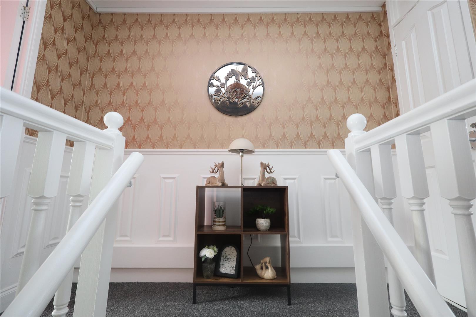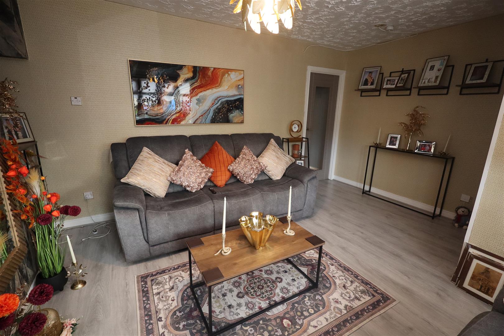 Laminate wood flooring, uPVC front door, wall panelling