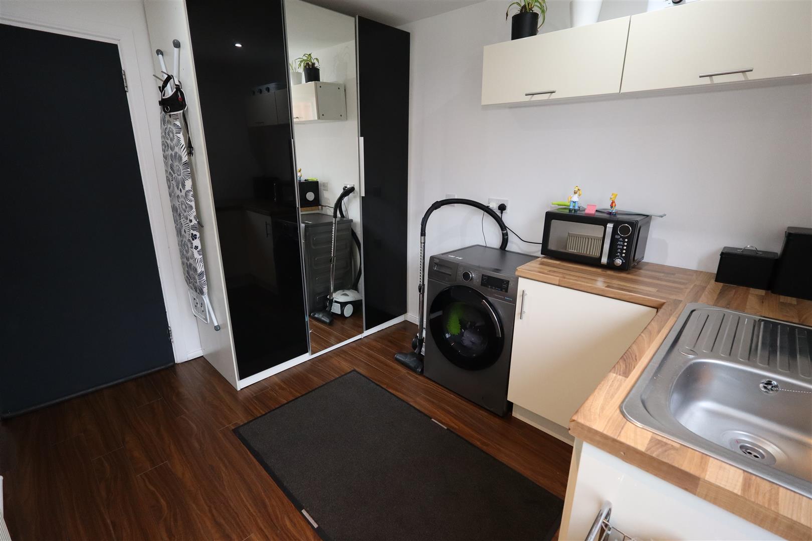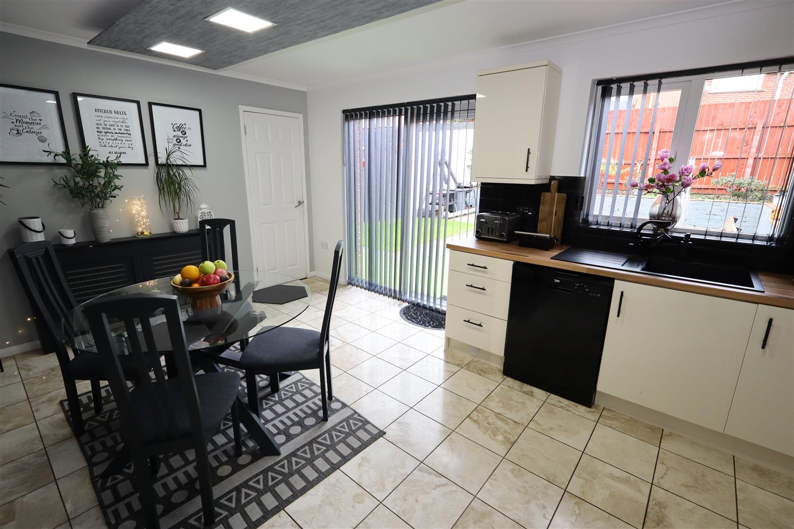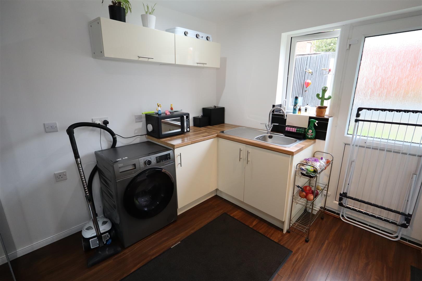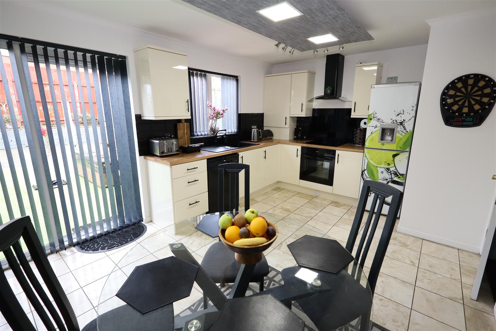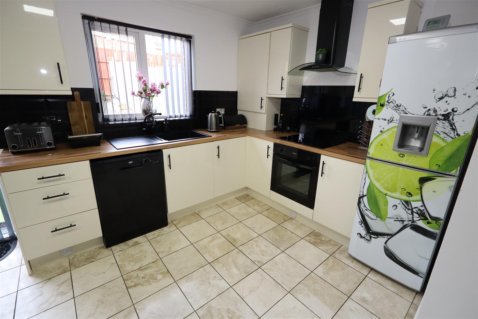 Modern fitted kitchen with range of high and low level units, round edge worksurfaces, ceramic sink unit with mixer tap, plumbed for dishwasher, built in hob, built in oven, plumbed for washing machine, stainless steel extractor fan, gas boiler, patio door to rear