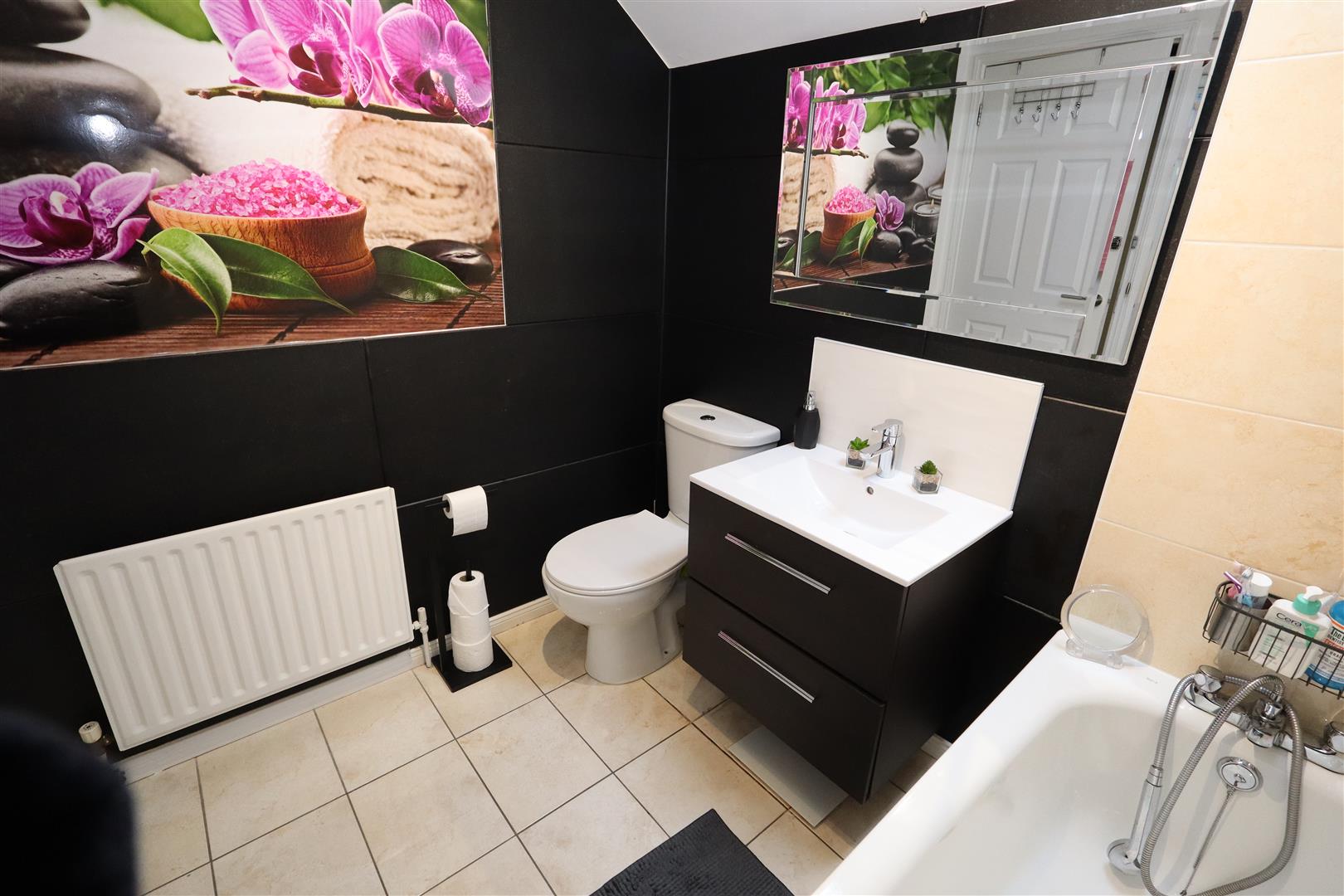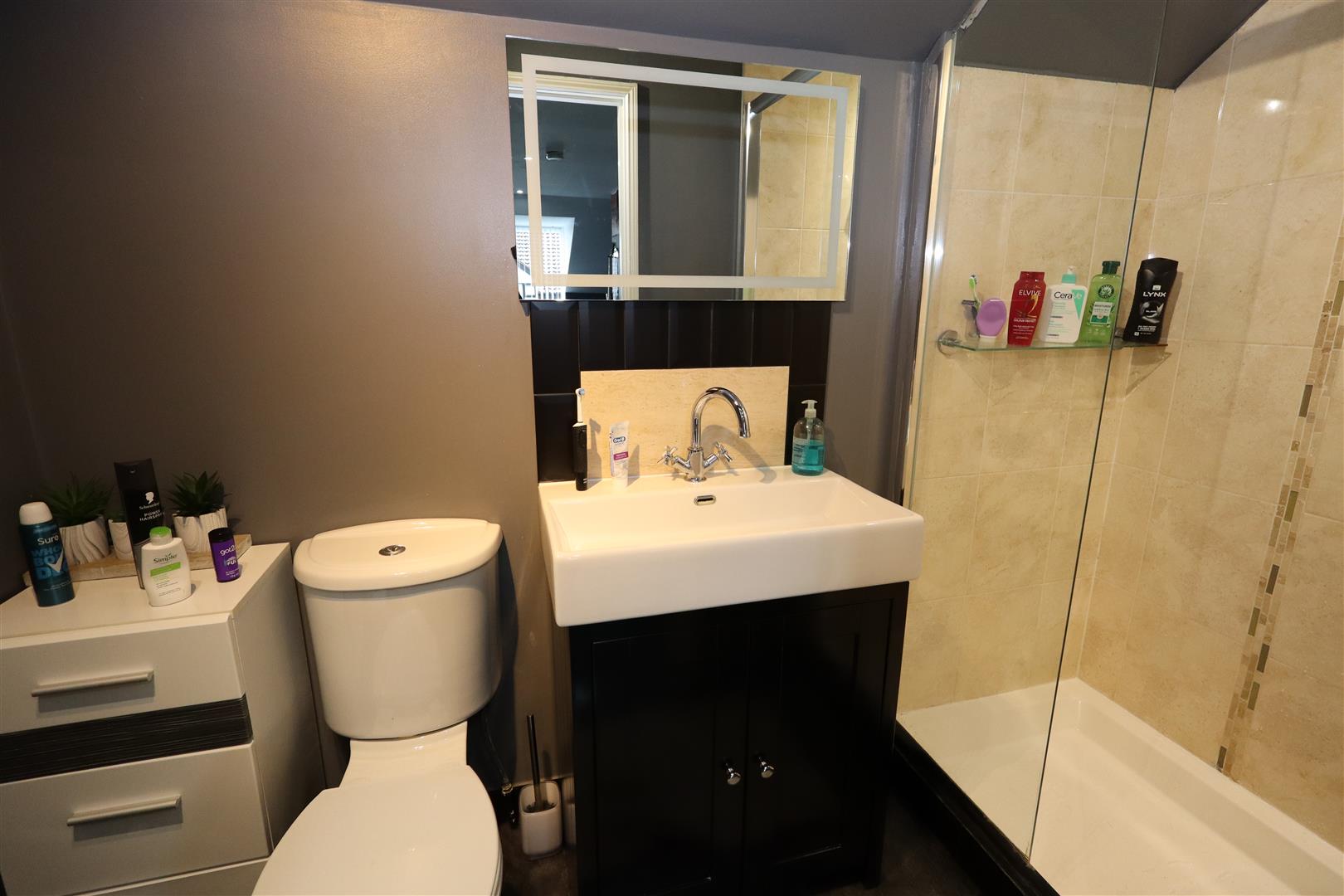 Low flush W/C, vanity unit with mixer tap, glazed shower screen, controlled shower, tiling, laminate wood flooring, extractor fan