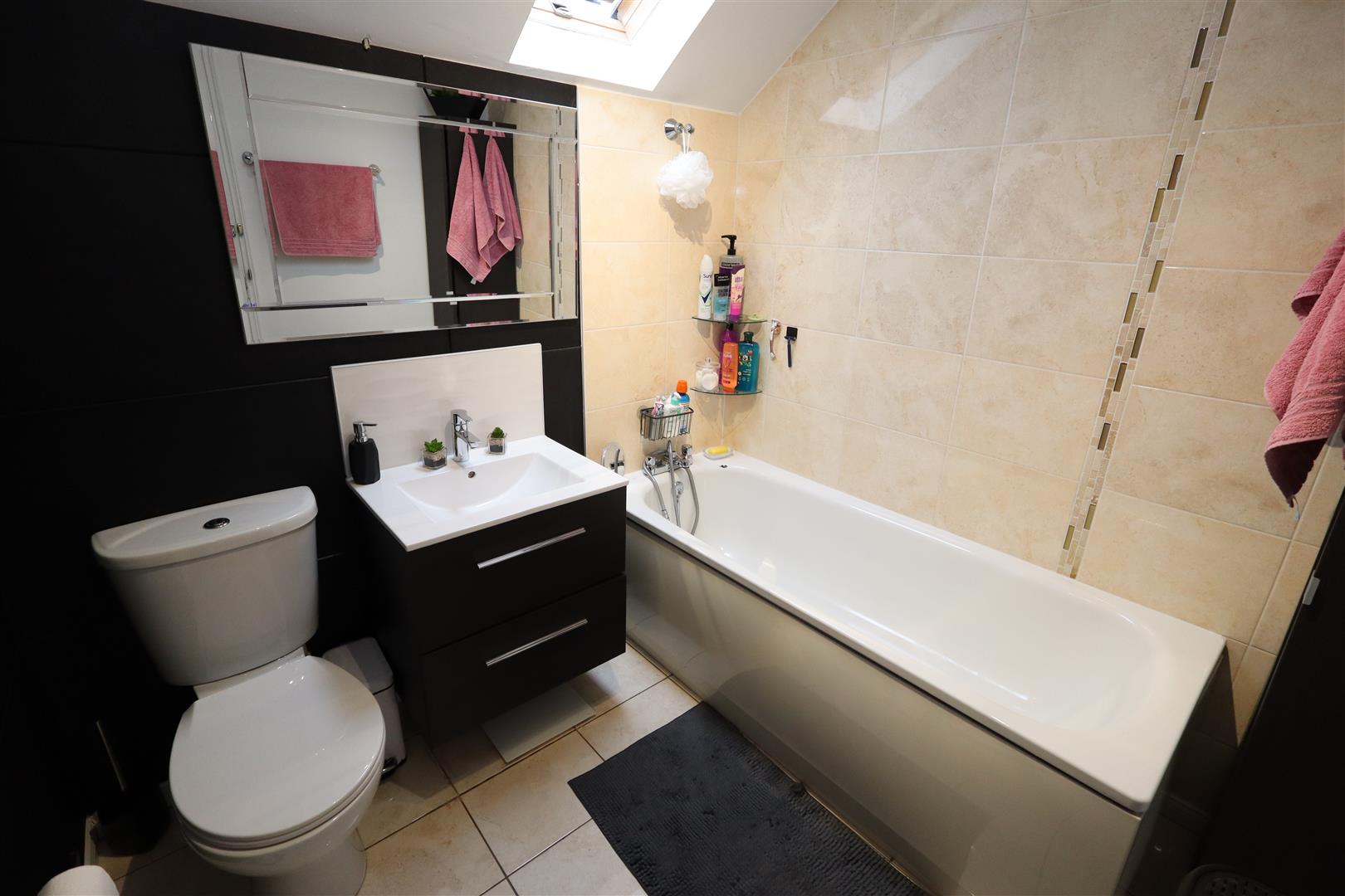 Modern white bathroom suite, low flush W/C, wall hung vanity unit with mixer tap, panelled bath with mixer tap, and hand shower, tiling, ceramic tiled flooring, Velux window, extractor fan
