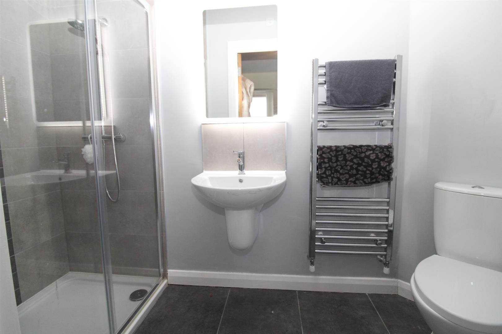 Glazed shower cubicle with feature rainfall shower and separate hand held shower, half pedestal wash hand basin, low flush W/C, chrome heated towel rail, wall tiling, ceramic tiled flooring, LED mirror, extractor fan