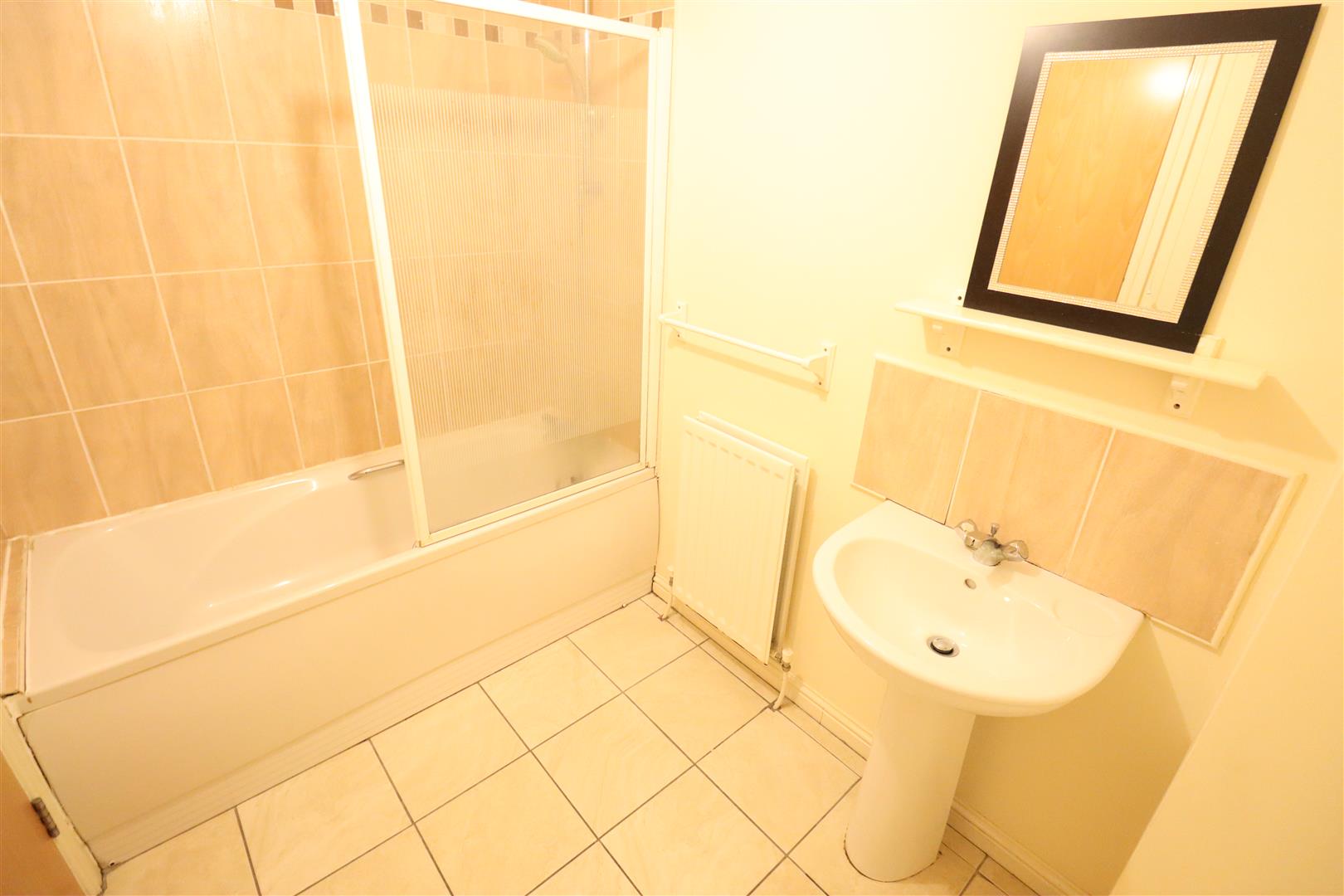 uPVC bath unit, thermostatically controlled shower, shower screen, pedestal wash hand basin, low flush W/C, ceramic tiled flooring, wall tiling, extractor fan