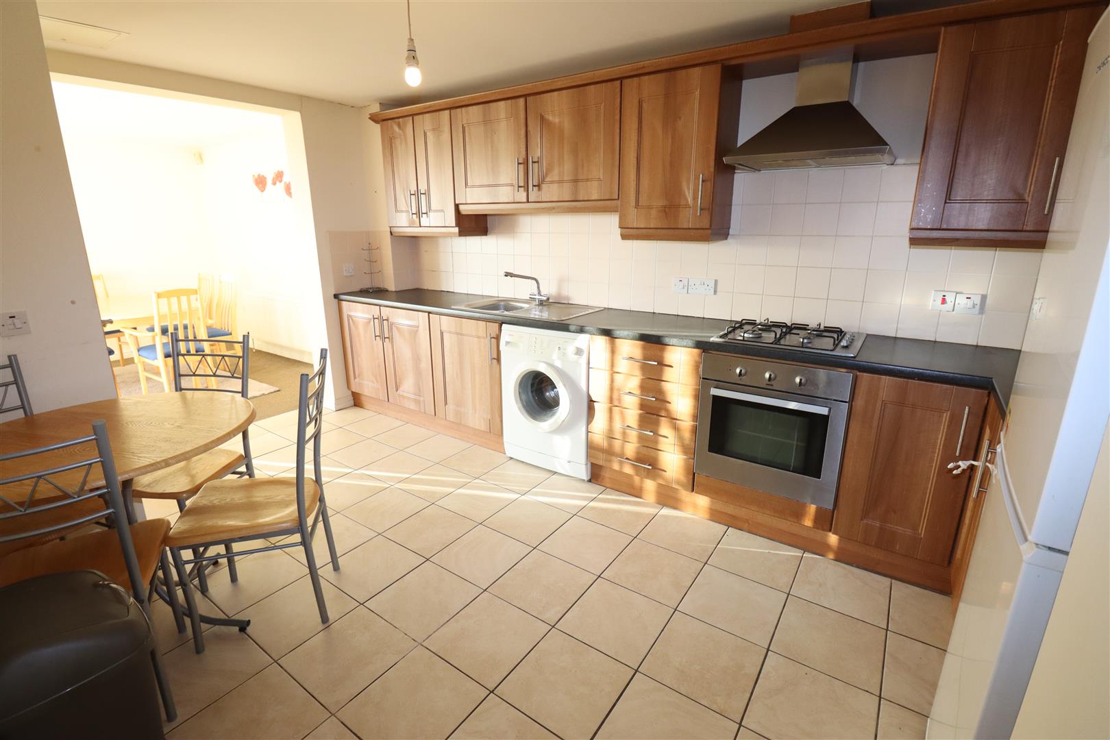 Range of high and low level units, round edge worksurfaces, single drainer stainless steel sink unit with mixer tap, stainless steel oven, gas hob, stainless steel extractor fan, wall tiling, plumbed for washing machine