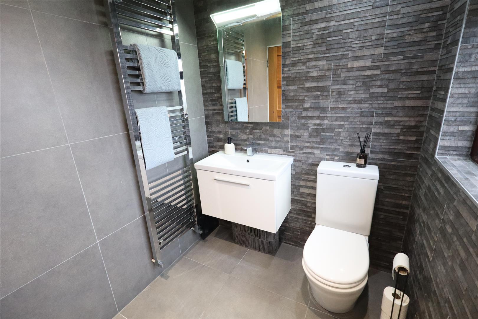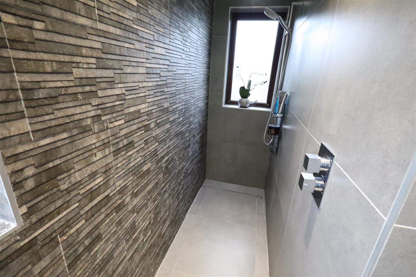 Walk in shower unit with thermostatically controlled shower, floating sink unit with mixer taps, low flush W/C, feature wall tiling, ceramic tiled flooring, downlighters, chrome heated towel rail