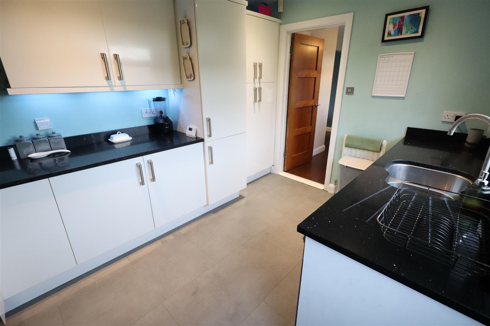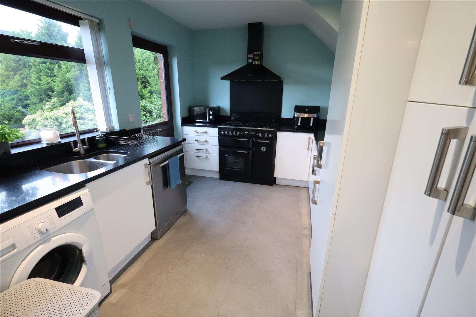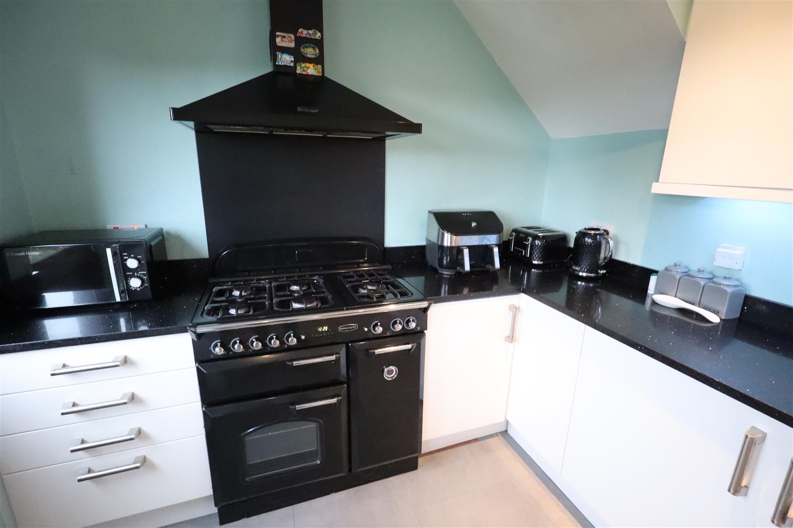 Range of high and low level units, round edge worksurfaces, built in fridge freezer, plumbed for washing machine, space for dishwasher, feature Range cooker, extractor hood, single drainer stainless steel sink unit with mixer tap and vegetable sink, downlighters, concealed lighting, uPVC back door