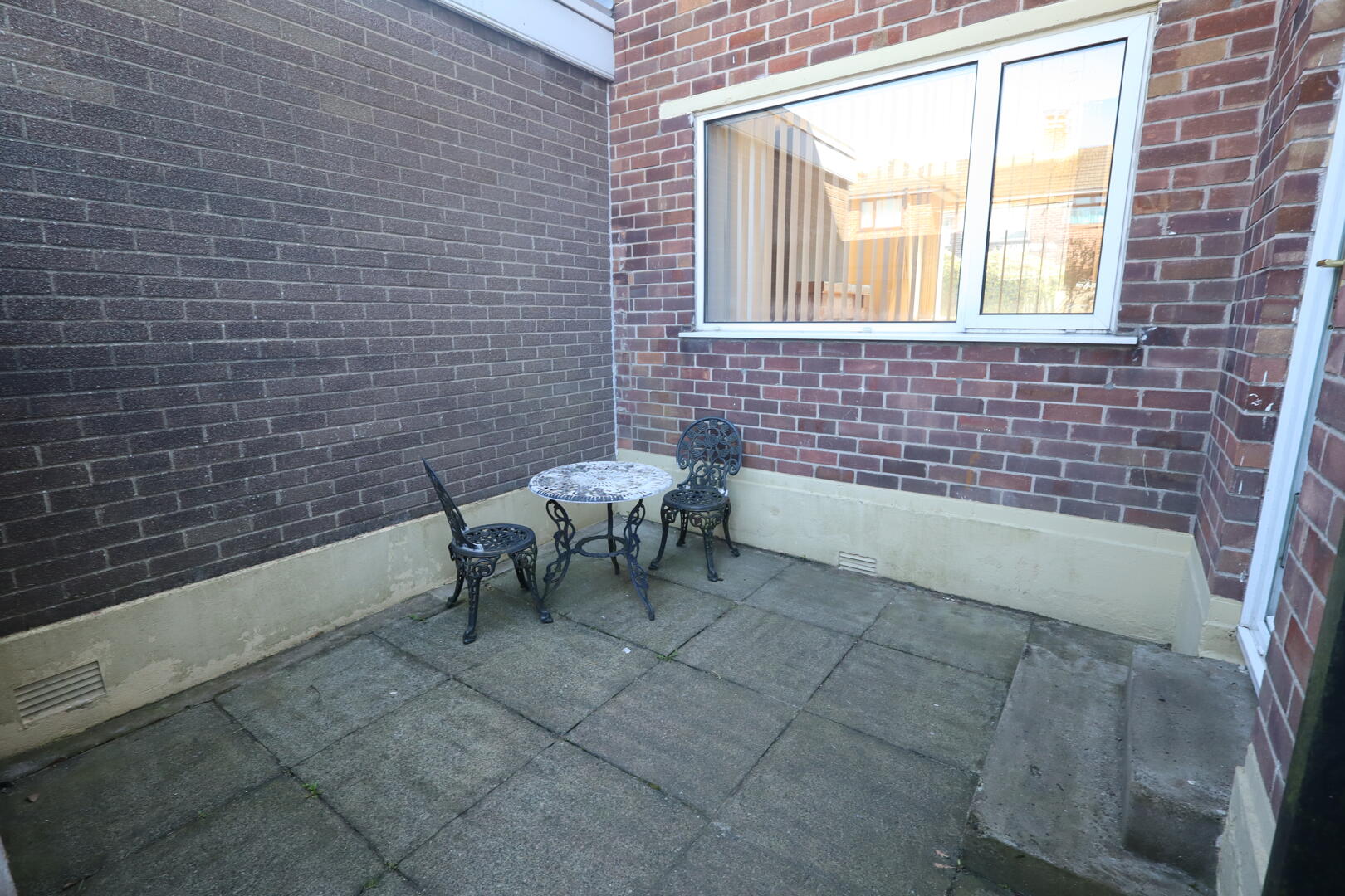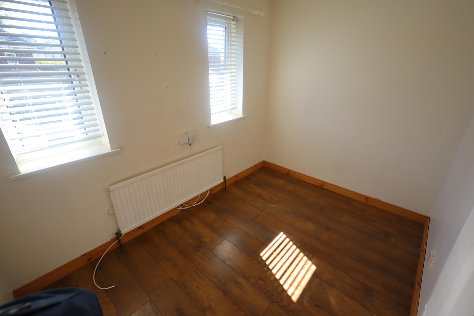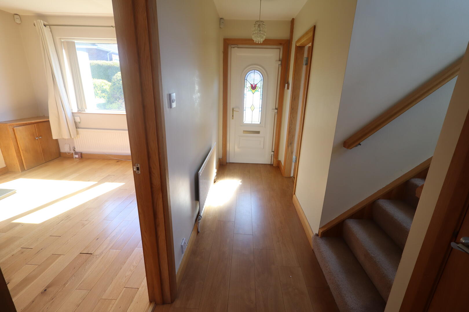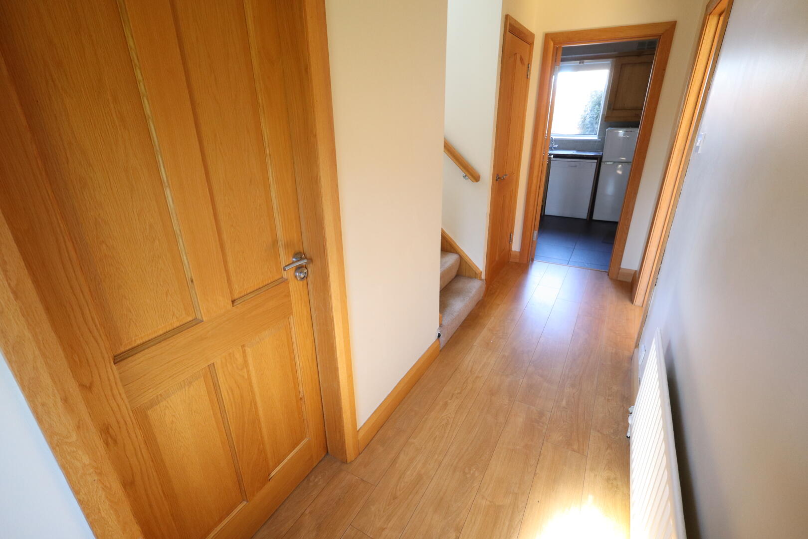 Laminate wood flooring, uPVC front door, storage cupboard