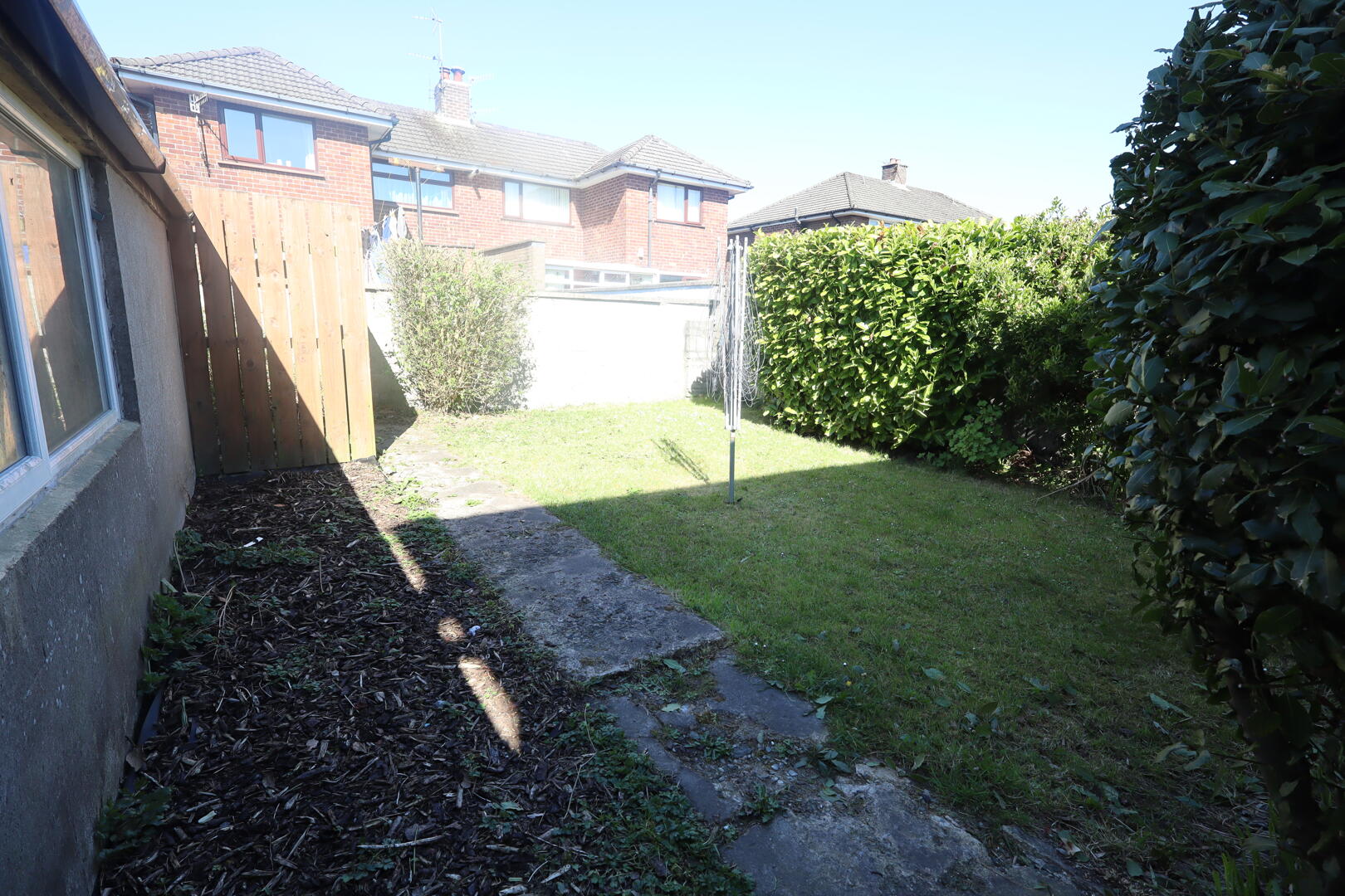 Front: in lawn, plants, hedges and shrubs, car port
