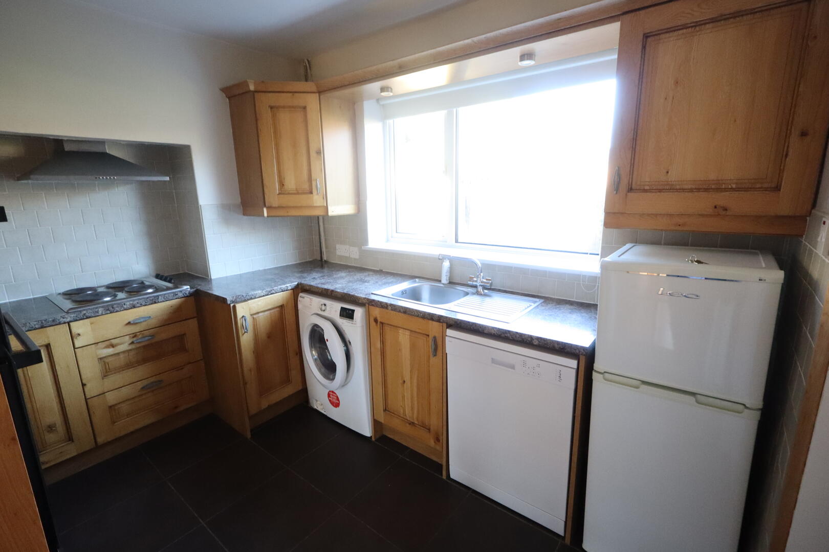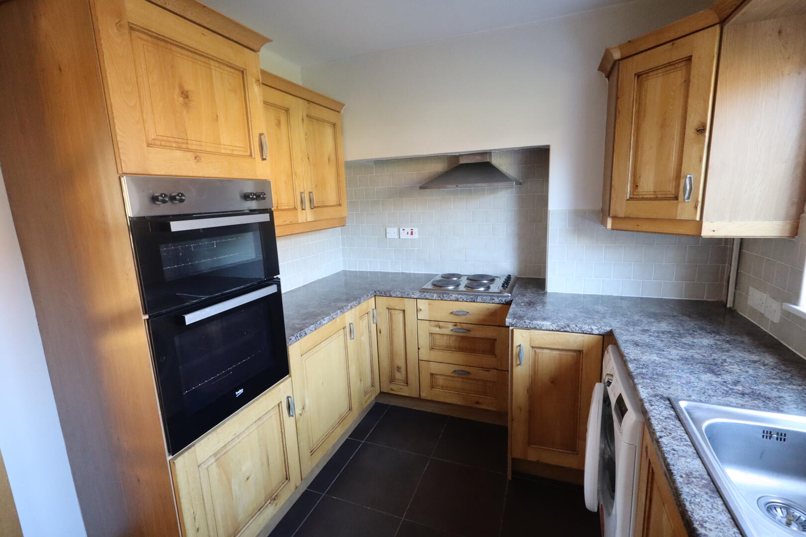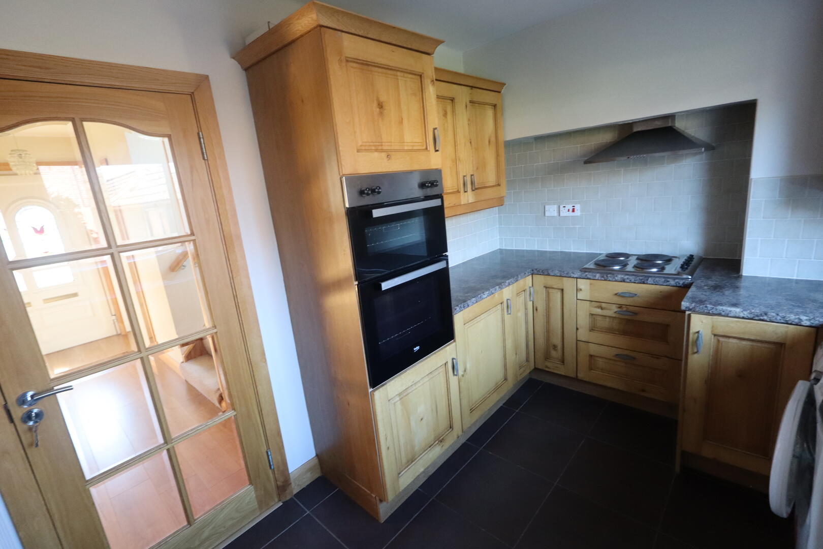 Range of high and low level units, single drainer stainless steel sink unit with mixer tap, inlaid hob, stainless steel extractor hood, built in double oven, uPVC back door, plumbed for washing machine, space for fridge freezer, space for dishwasher, fluorescent light