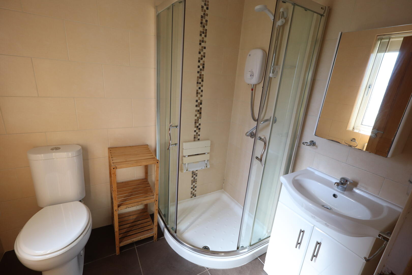 Corner shower unit, electric shower, glazed shower screen, vanity sink unit, low flush W/C, panelled ceiling, downlighters, ceramic tiled flooring, wall tiling