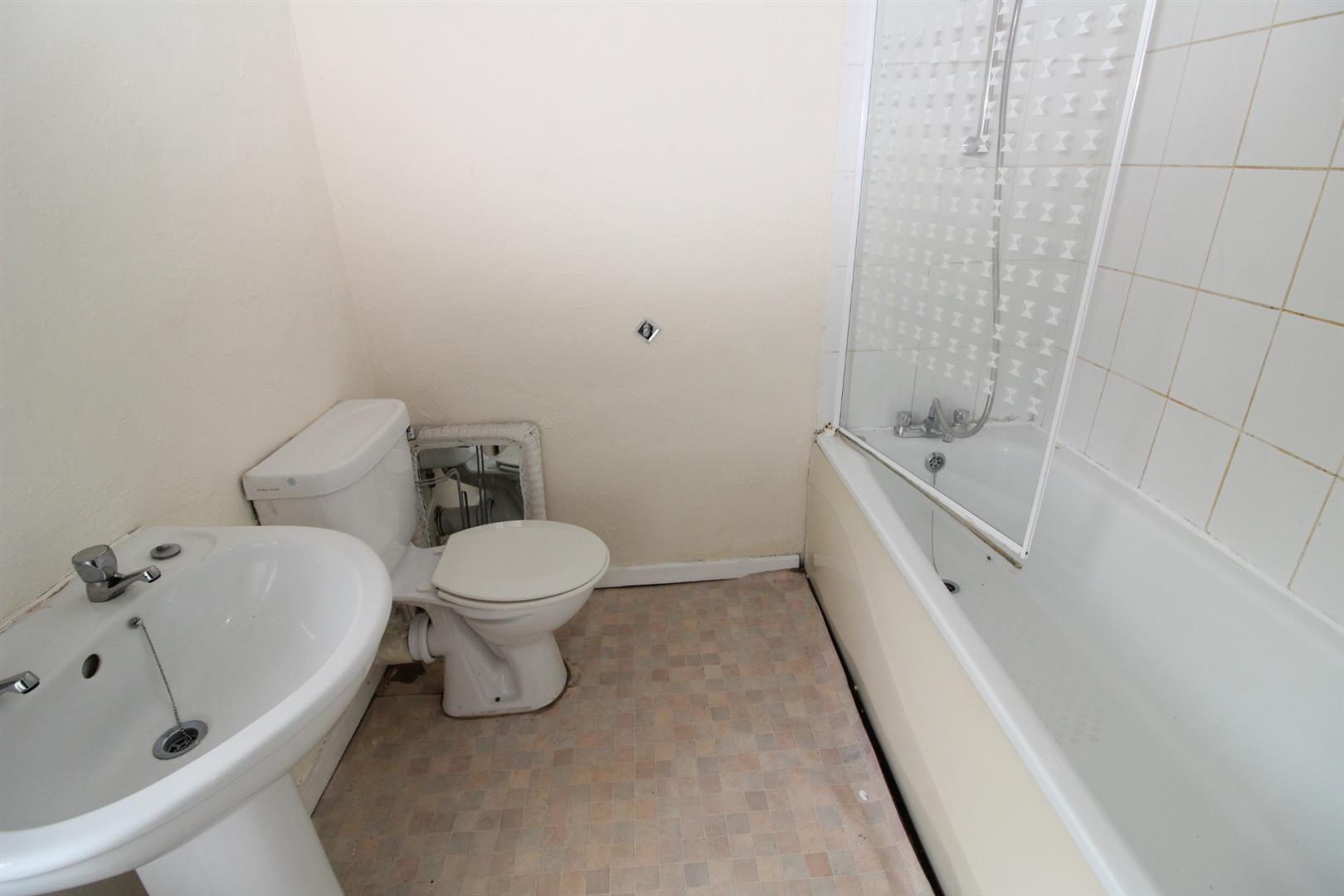 White suite comprising panel bath, glazed shower screen, thermostatically controlled shower, low flush wc, pedestal wash hand basin, wall tiling.