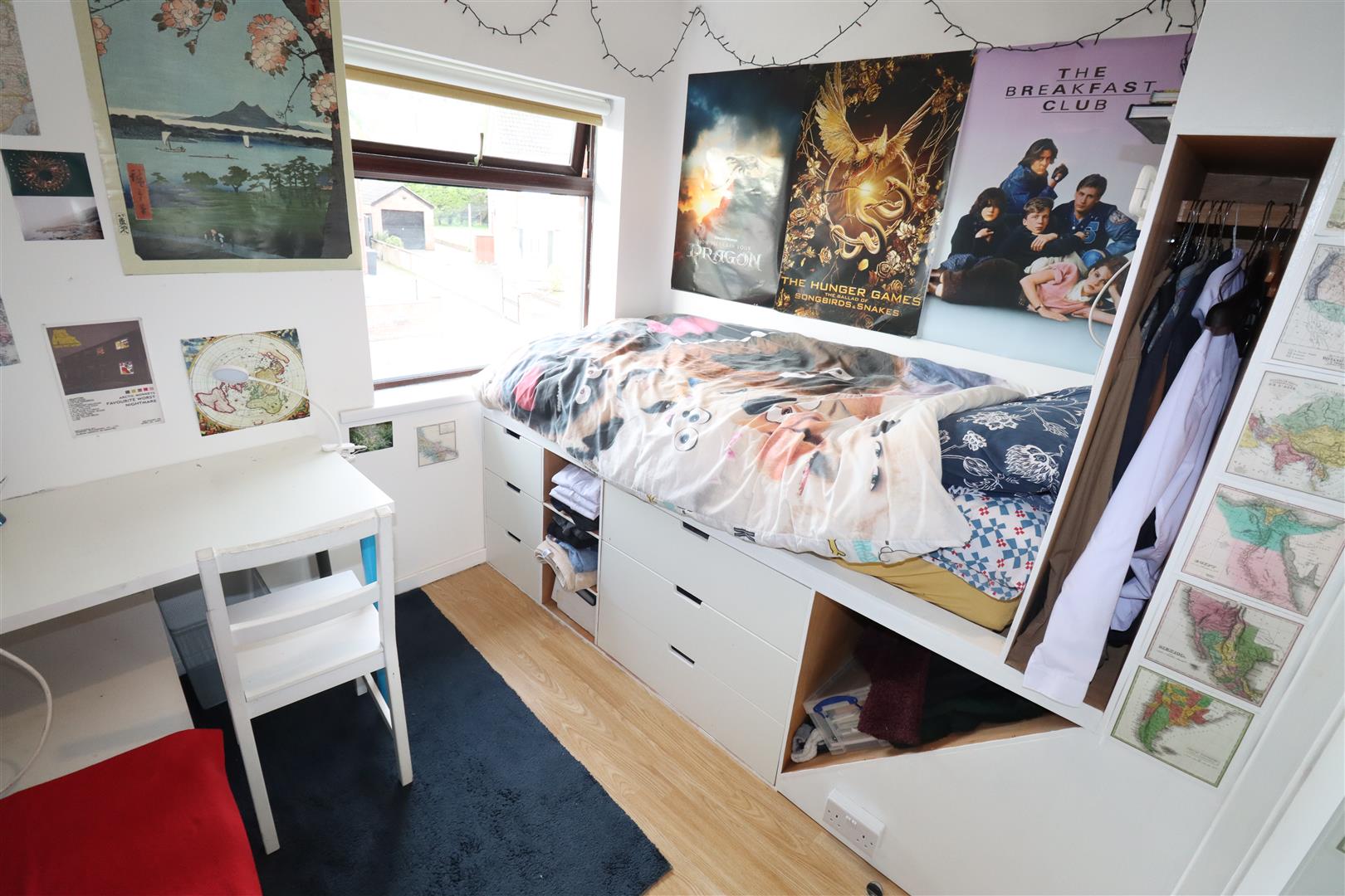 Laminate wood flooring, built in wardrobes