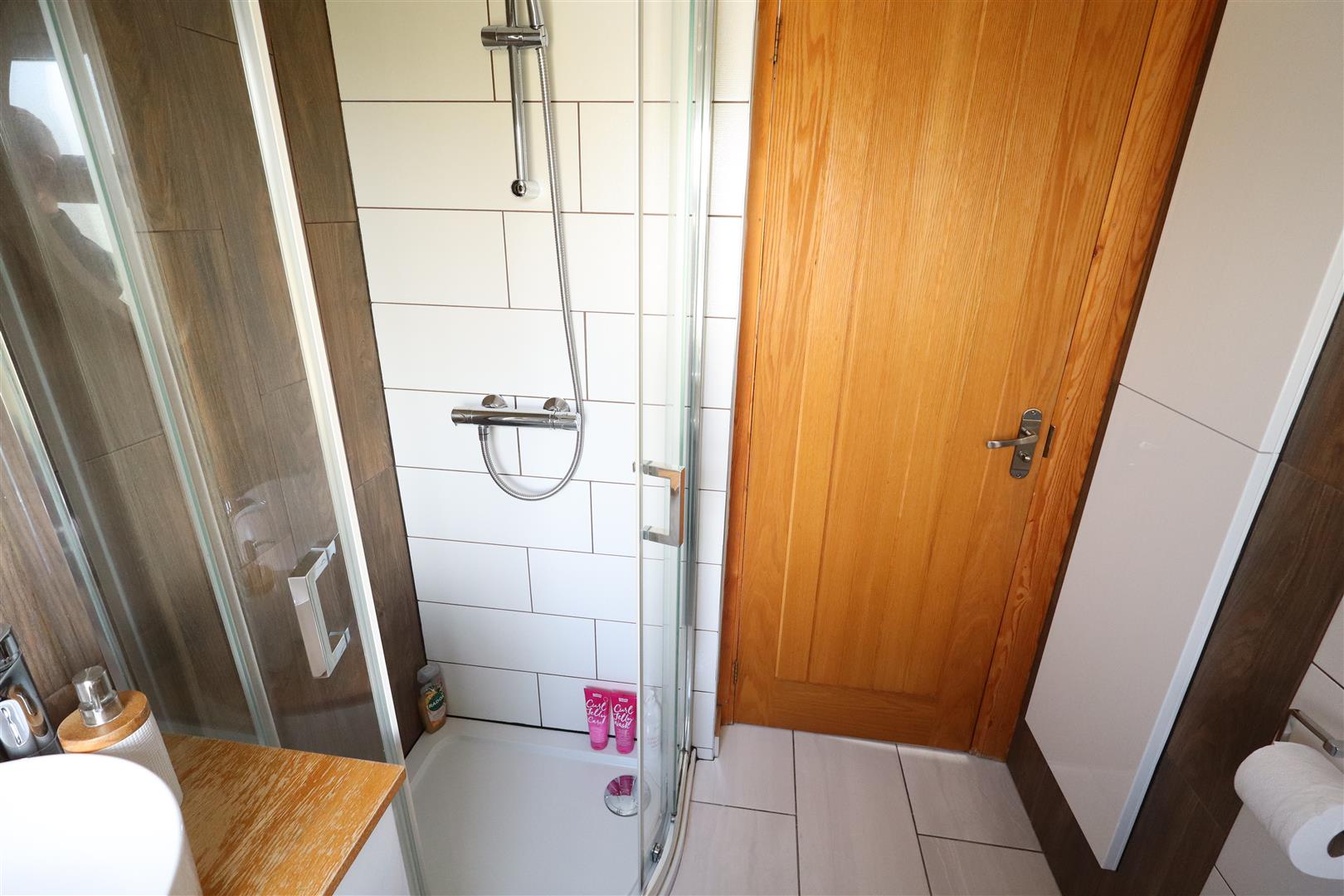 Shower unit with thermostatically controlled shower, glazed shower screen, luxury wall tiling, ceramic tiled flooring, low flush W/C, floating modern vanity sink unit, mixer taps, built in storage units