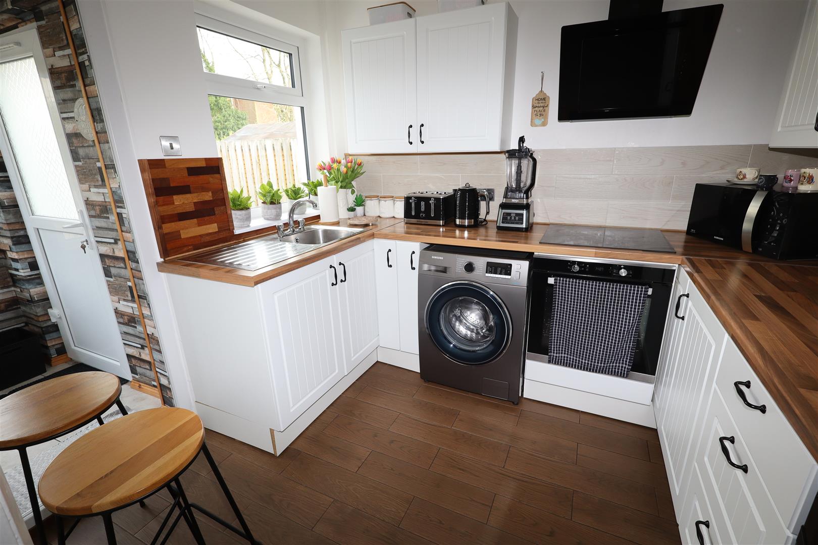 Modern fitted kitchen, range of high and low level units, round edge work surfaces, stainless steel oven, inlaid hood, modern extractor hood, single drainer stainless steel sink unit, mixer taps, plumbed for washing machine, laminate wooden flooring