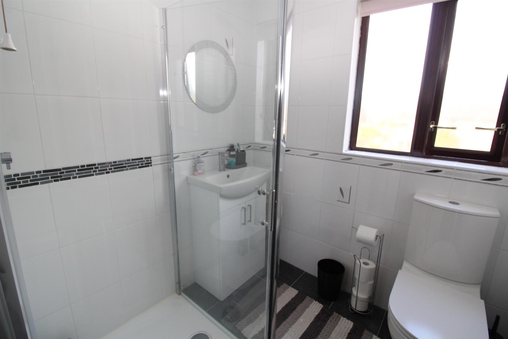 Shower unit with electric shower and rainwater effect shower head, glazed shower screen, vanity sink unit, low flush W/C, extractor fan, wall tiling, chrome heated towel rail
