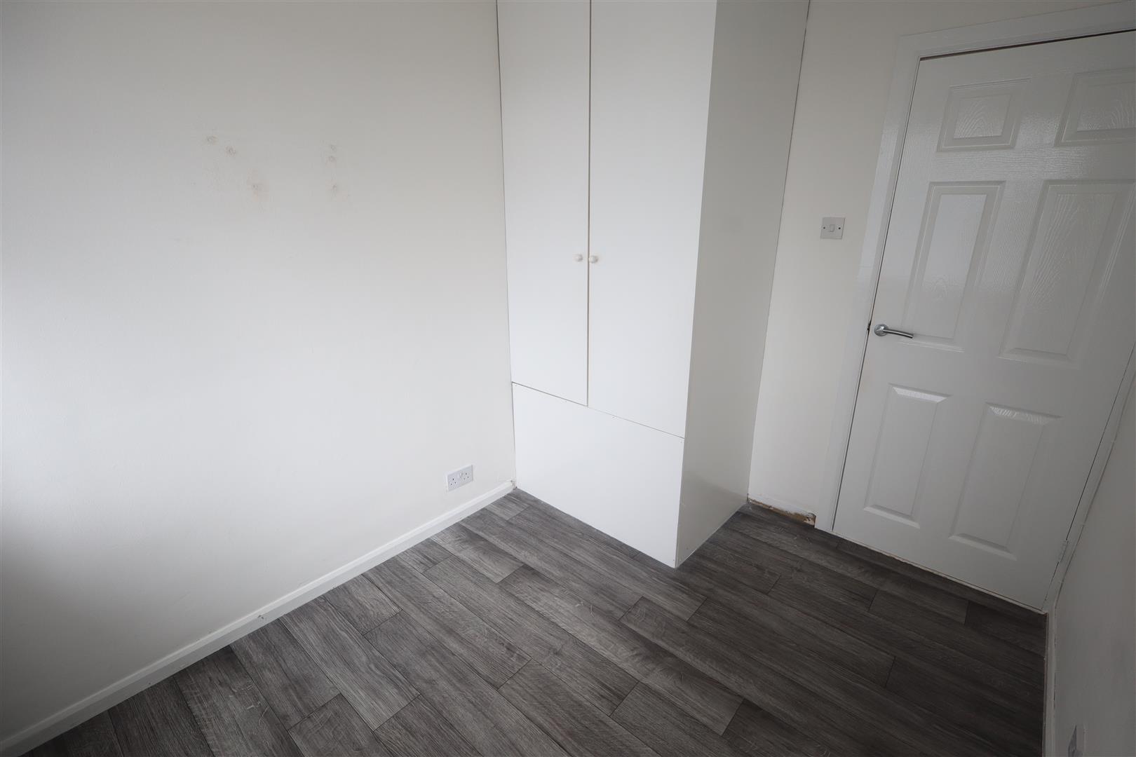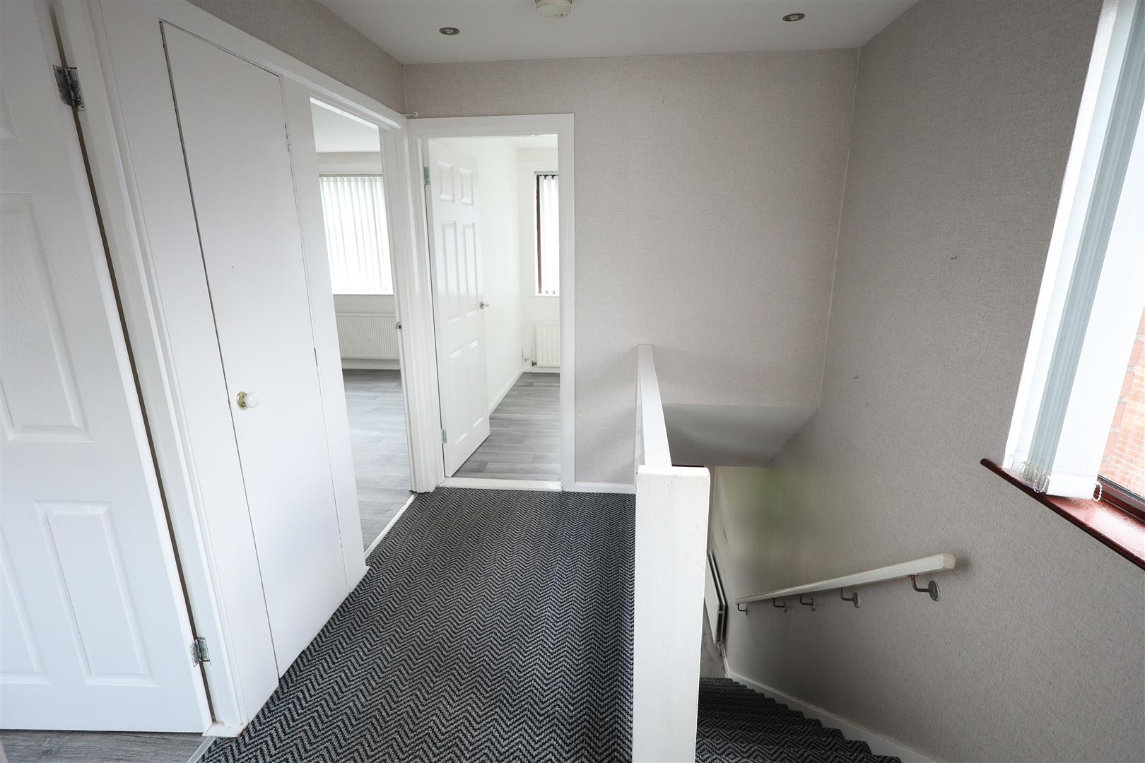 Shaker style kitchen, range of high and low level units, round edge worksurfaces, single drainer stainless steel sink unit with mixer taps, plumbed for washing machine, uPVC back door, LVT flooring, downlighters, understairs storage and separate storage cupboard
