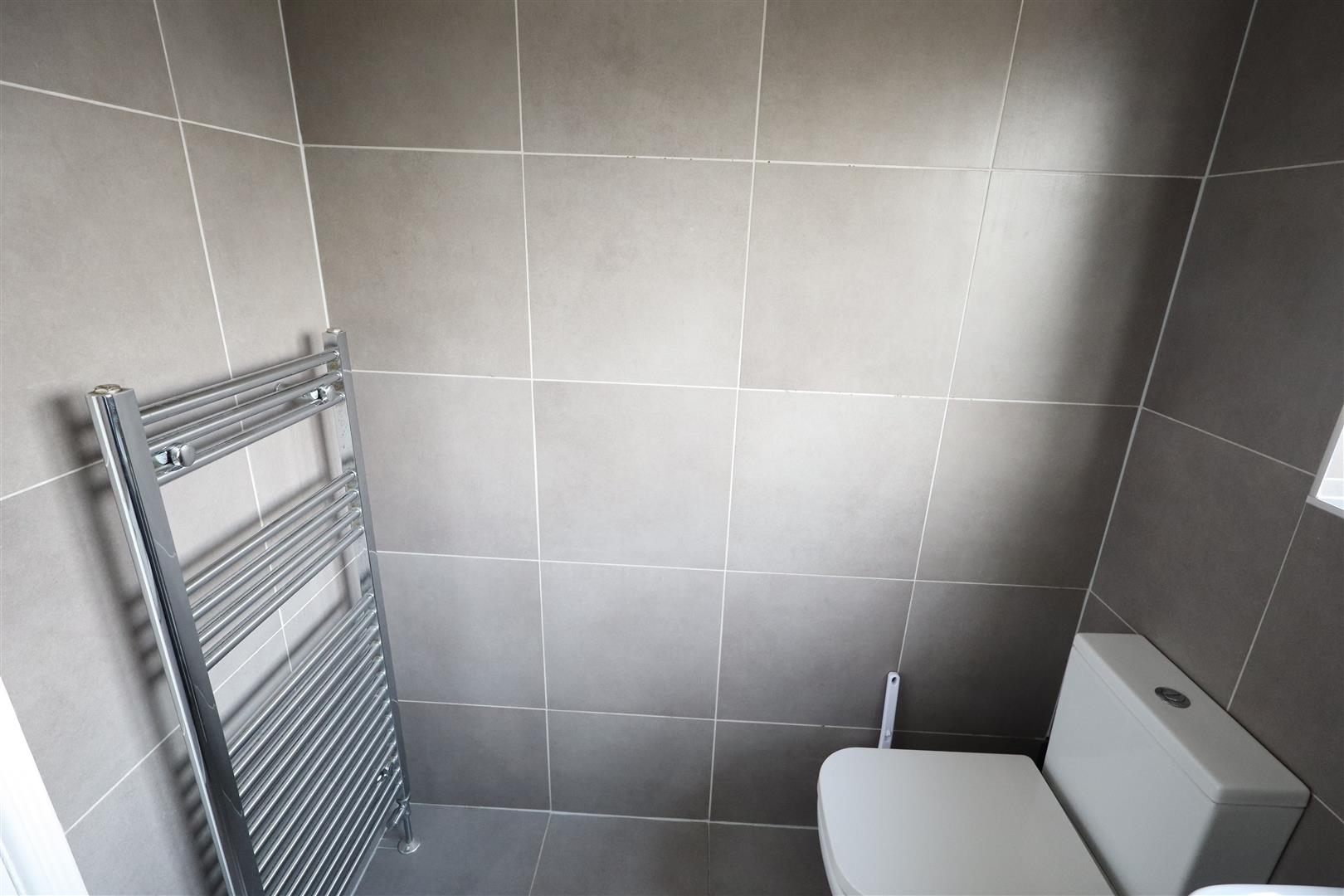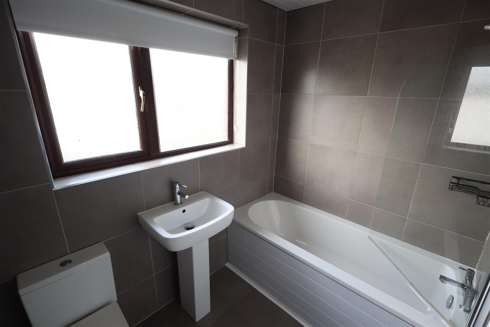 Modern bathroom, PVC panelled bath, electric shower, glazed shower screen, wall tiling, low flush W/C, pedestal wash hand basin, ceramic tiled flooring, downlighters, PVC panelled ceiling, chrome heated towel rail