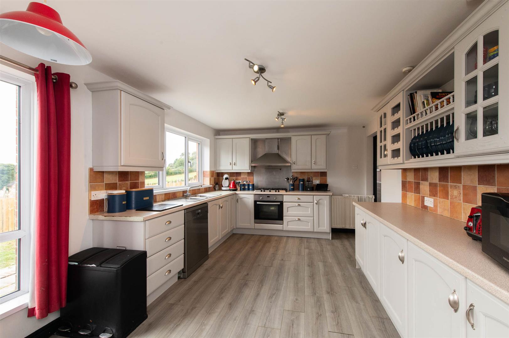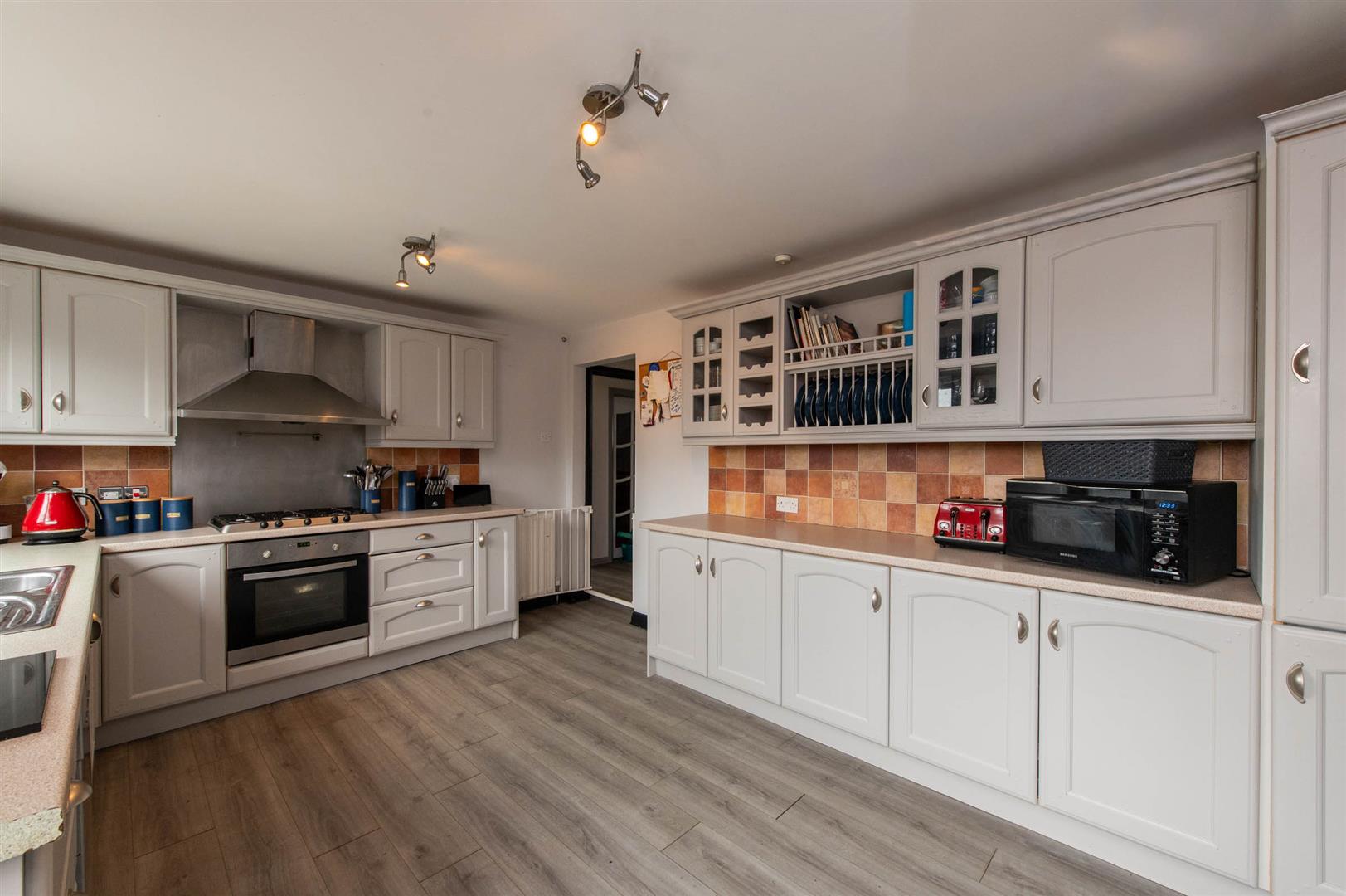 Range of high and low level units, round edge worksurfaces, single drainer stainless steel sink unit with vegetable sink, built in stainless steel oven and hob, stainless steel extractor fan and canopy, stainless steel splashback, glazed display units, plate rack, wine rack, wall tiling, laminate wood flooring, plumbed for dishwasher