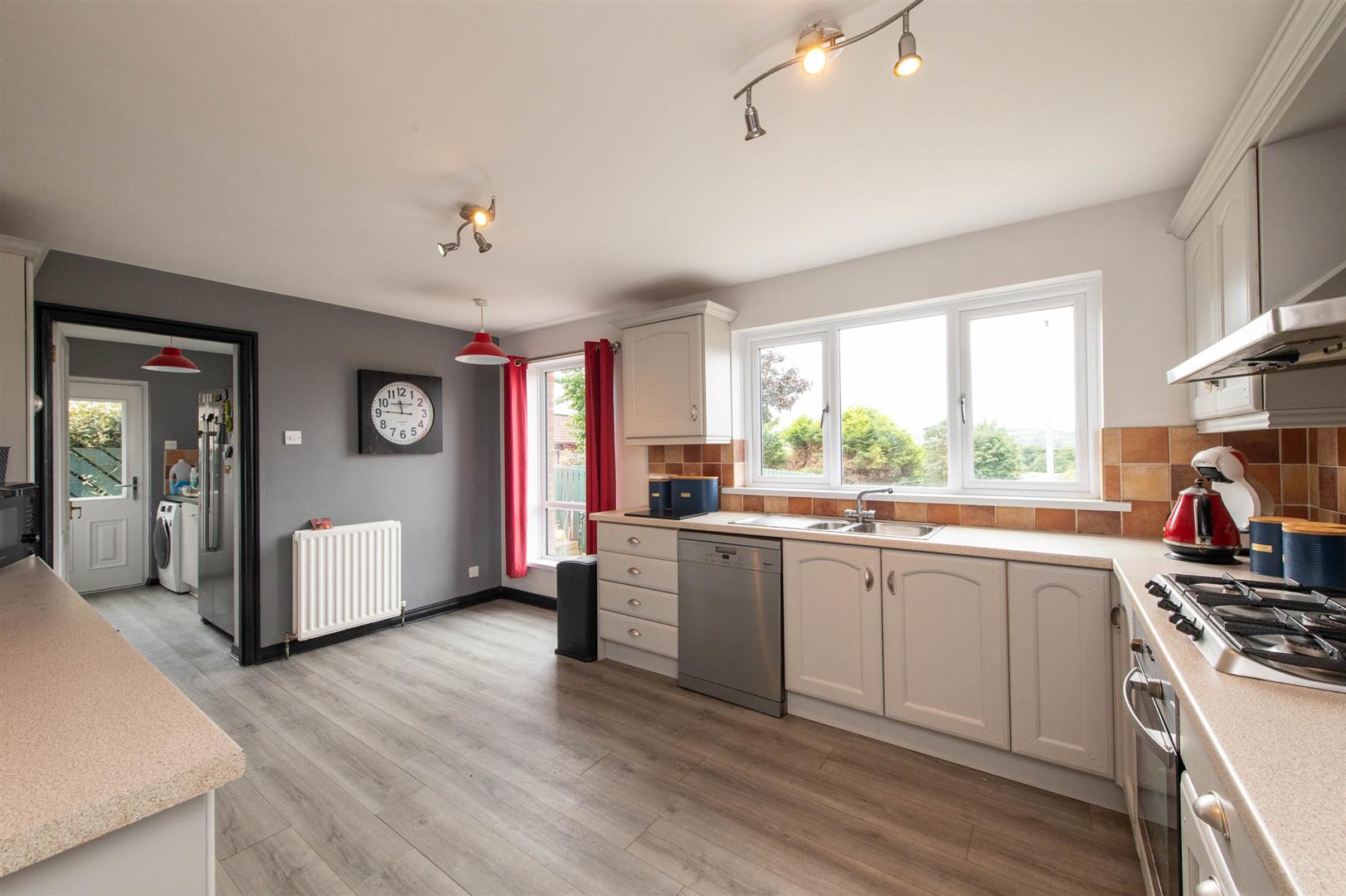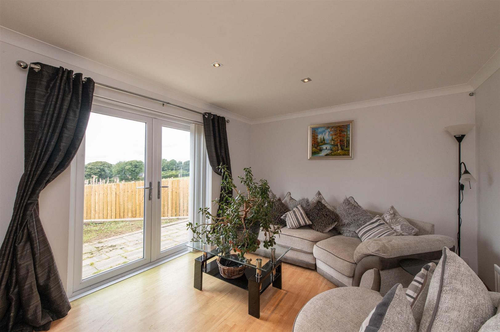 Laminate wood flooring, downlighters, double glazed french doors to rear