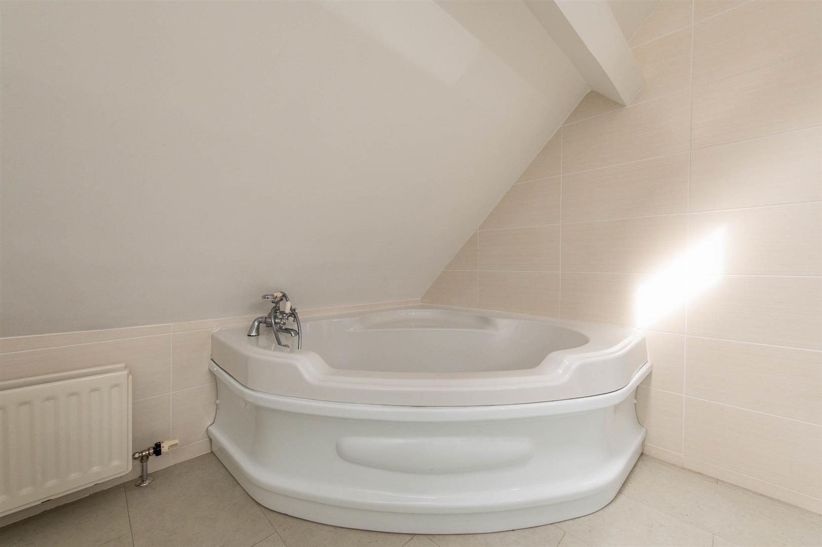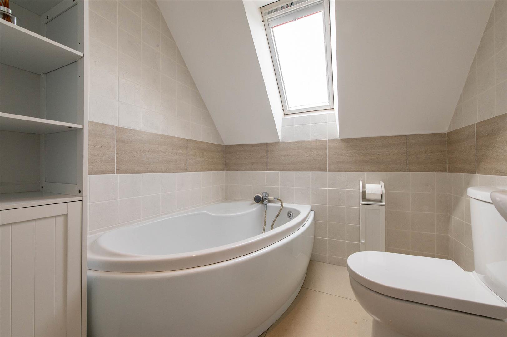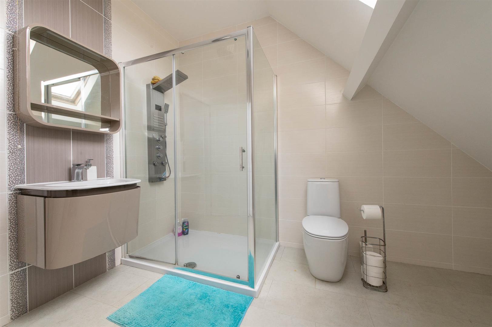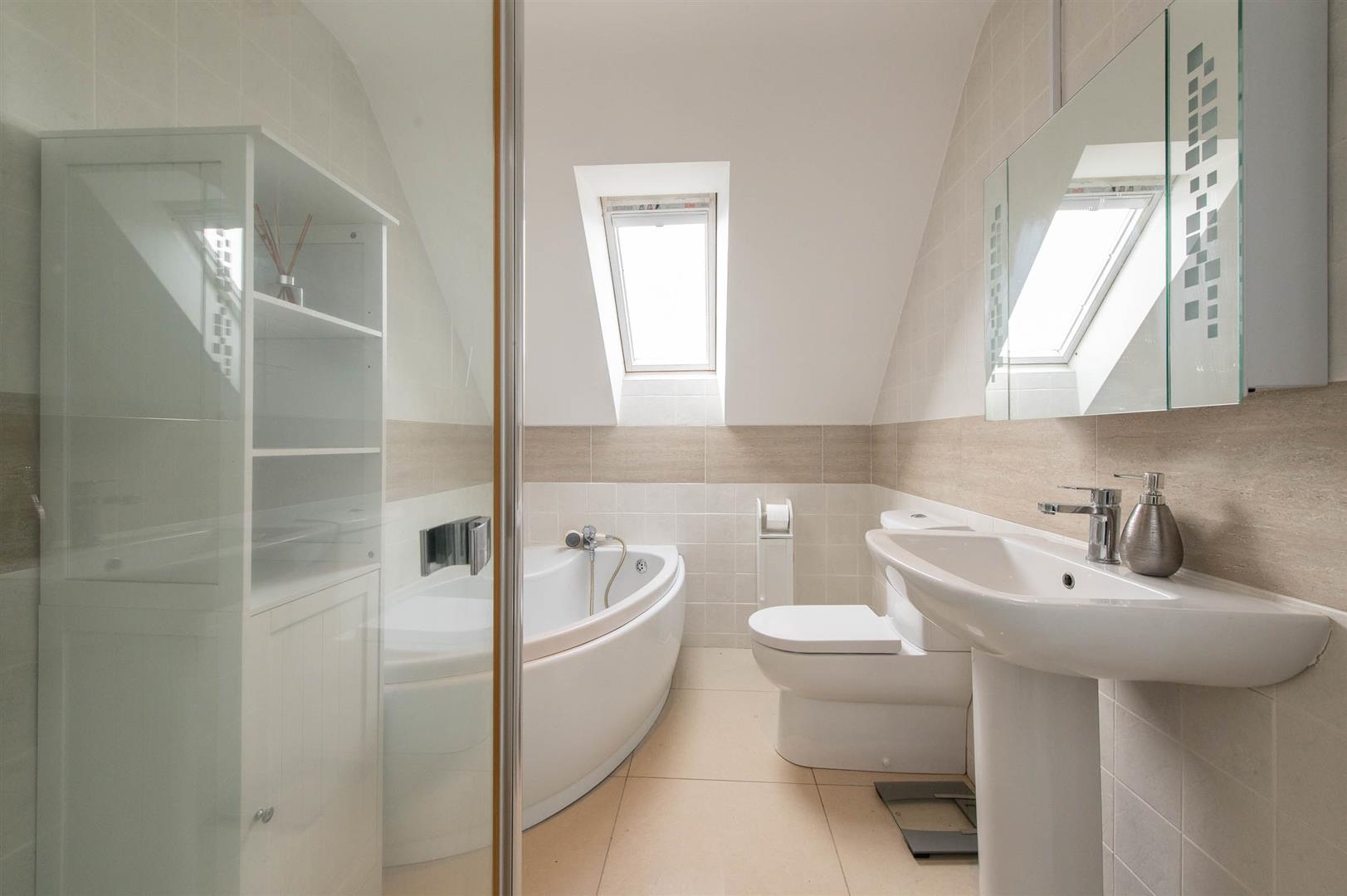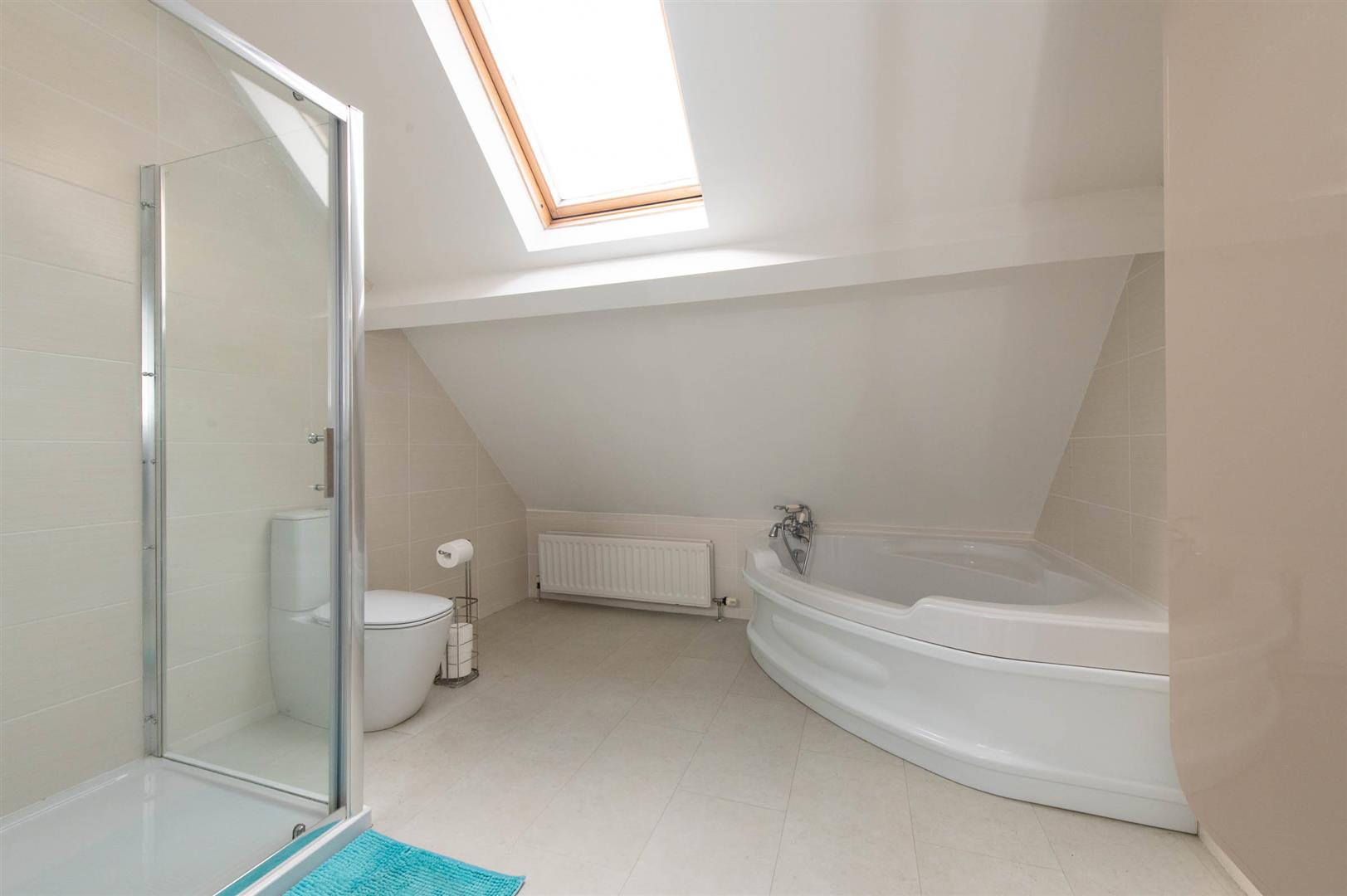 Corner bath, glazed shower cubicle with feature shower, vanity unit sink, wall tiling, Velux window