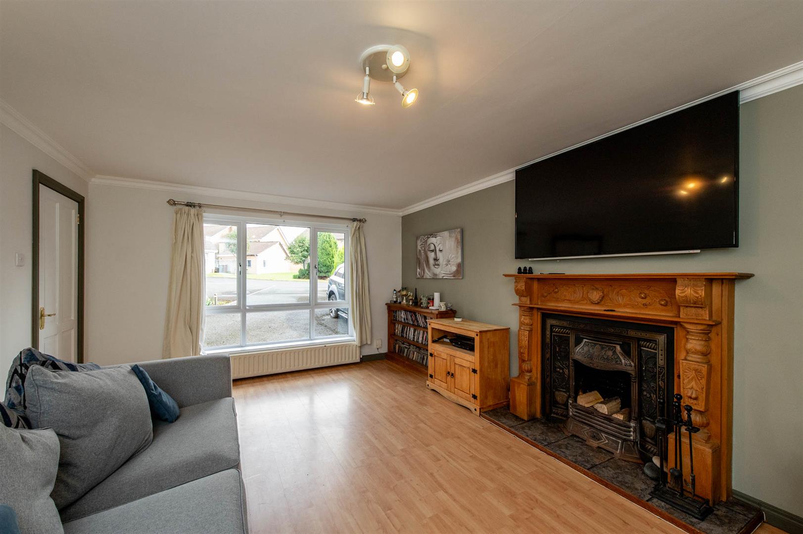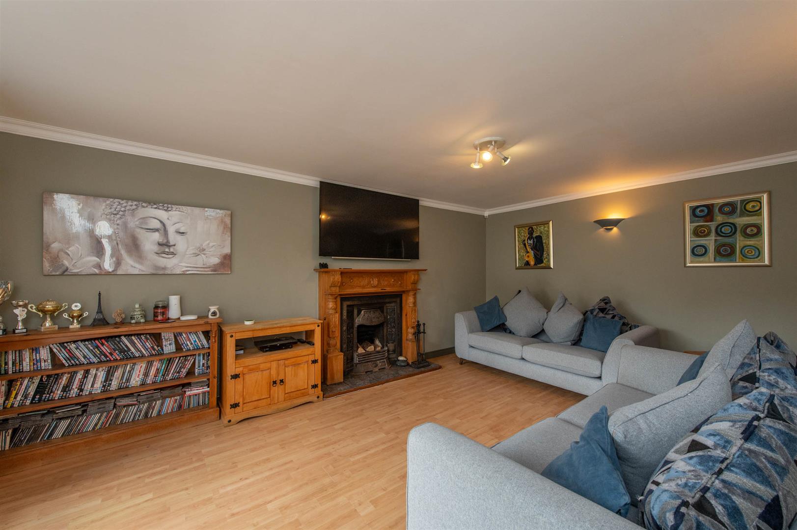 Cast iron fireplace with open fire, tiled hearth, laminate wood flooring, cornicing