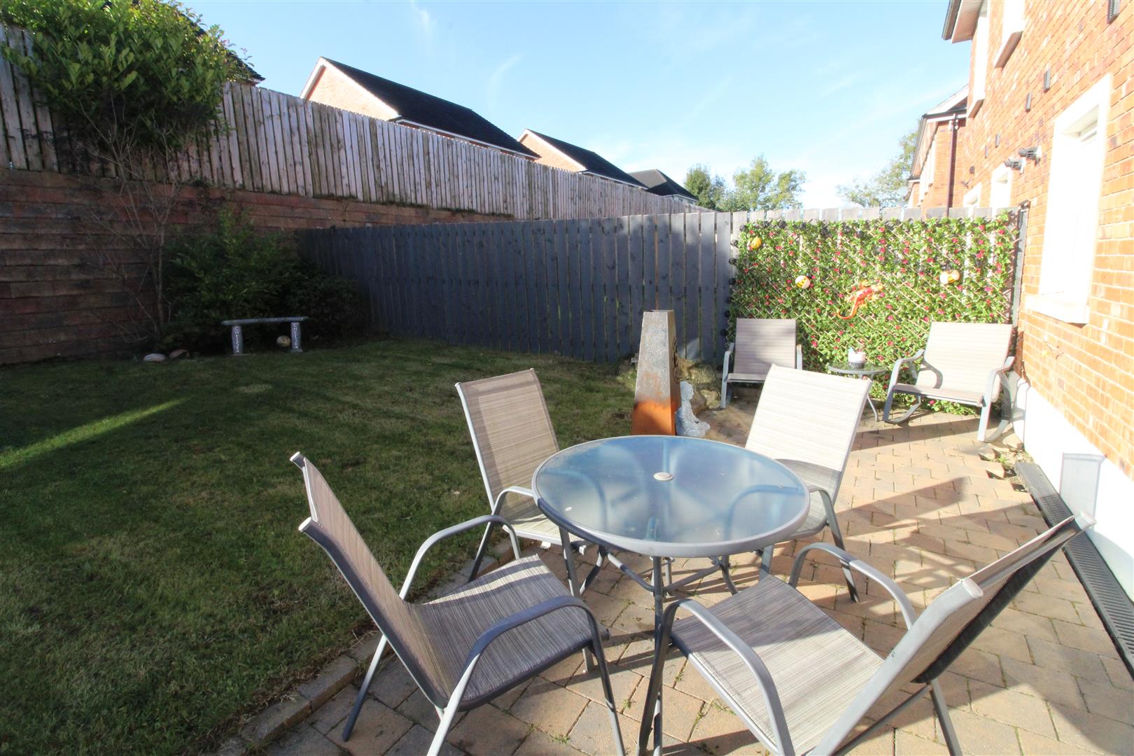 Enclosed rear garden in lawn, brick paved area, outside lighting and tap