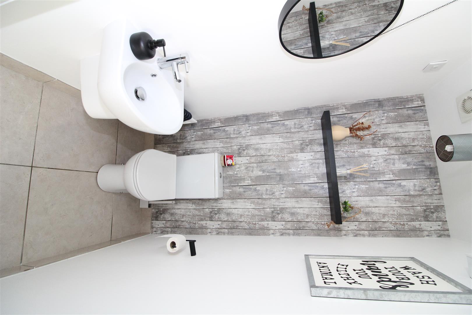 Low flush W.C, half pedestal wash hand basin, ceramic tile floor, extractor fan