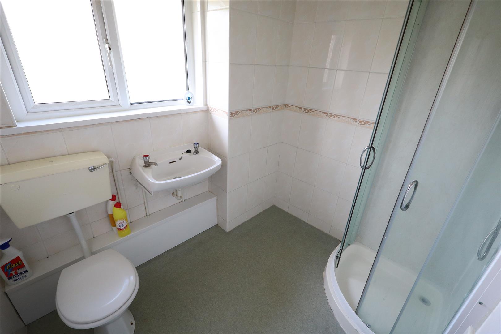 Shower unit, electric shower, glazed shower screen, low flush W/C, wash hand basin, wall tiling