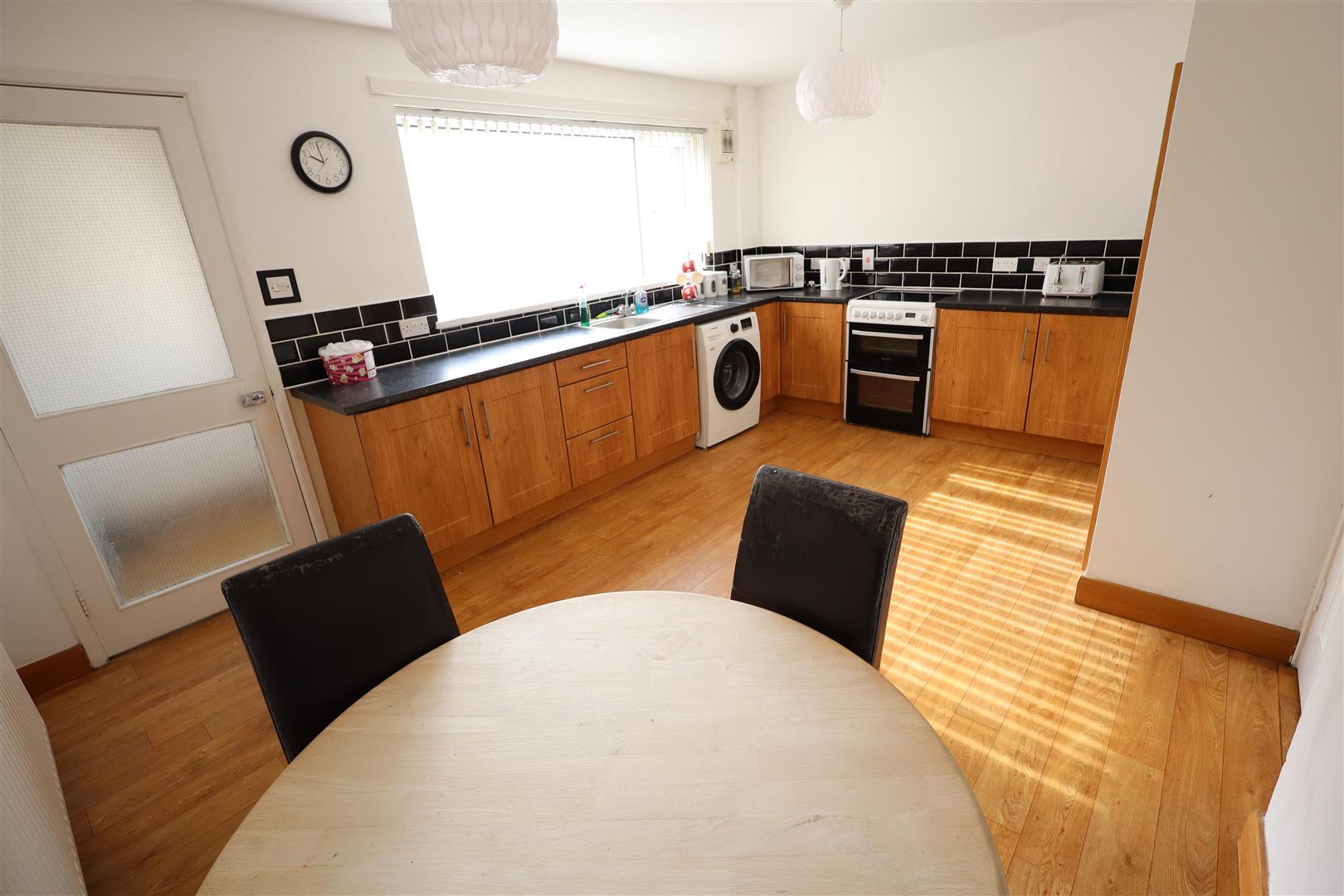 Range of high and low level units, round edge work surfaces, single drainer stainless steel sink unit, mixer taps, cooking point, wall tiling, space for fridge freezer, plumbed for washing machine