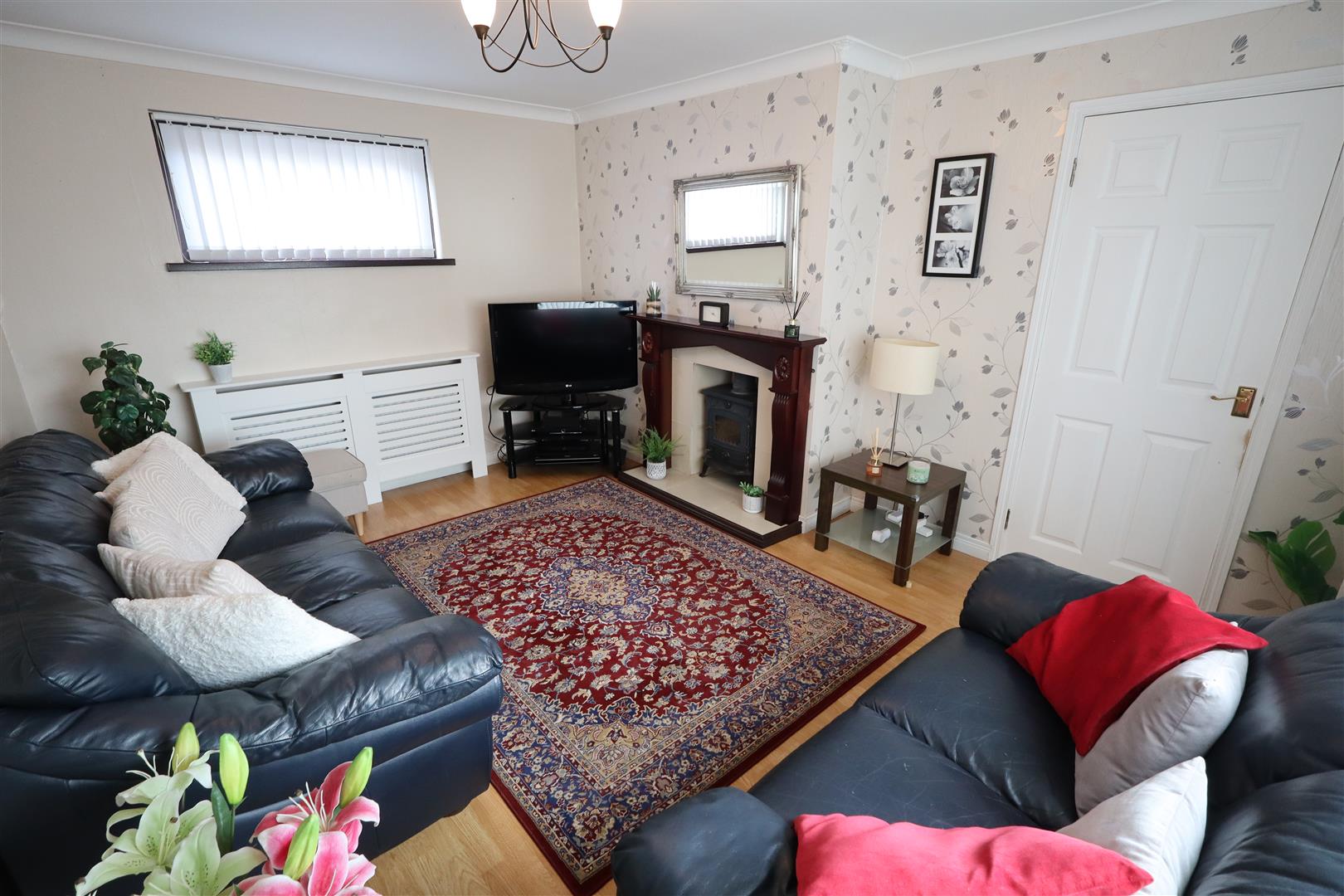 Laminate wood flooring, multi fuel stove, cornicing