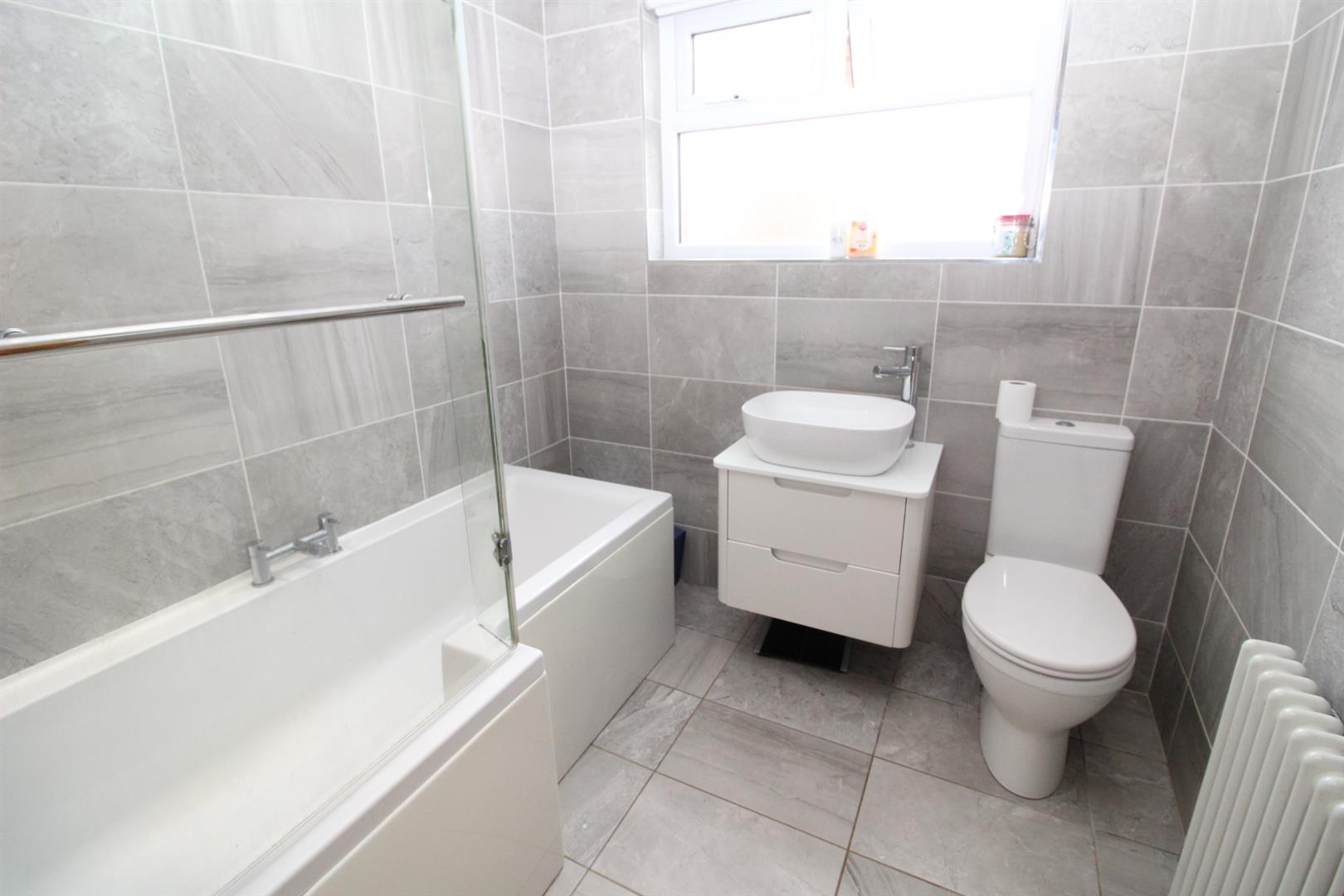 Modern white bathroom suite comprising panelled bath, glazes shower screen, Redring electric shower, vanity unit with sink, low flush WC, fully tiled walls, feature radiator, downlighters, extractor fan