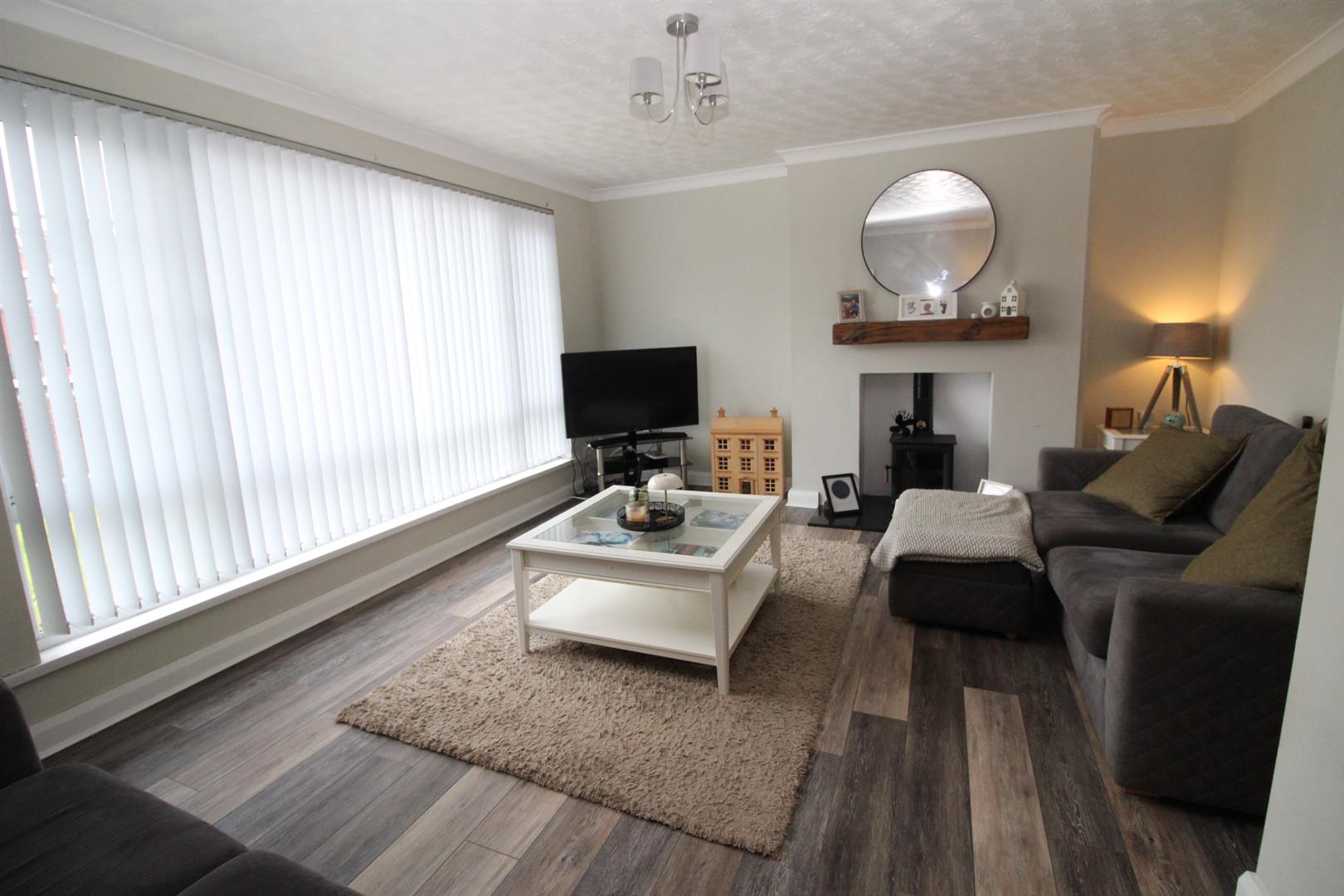 Spacious lounge with solid wood flooring and feature fireplace