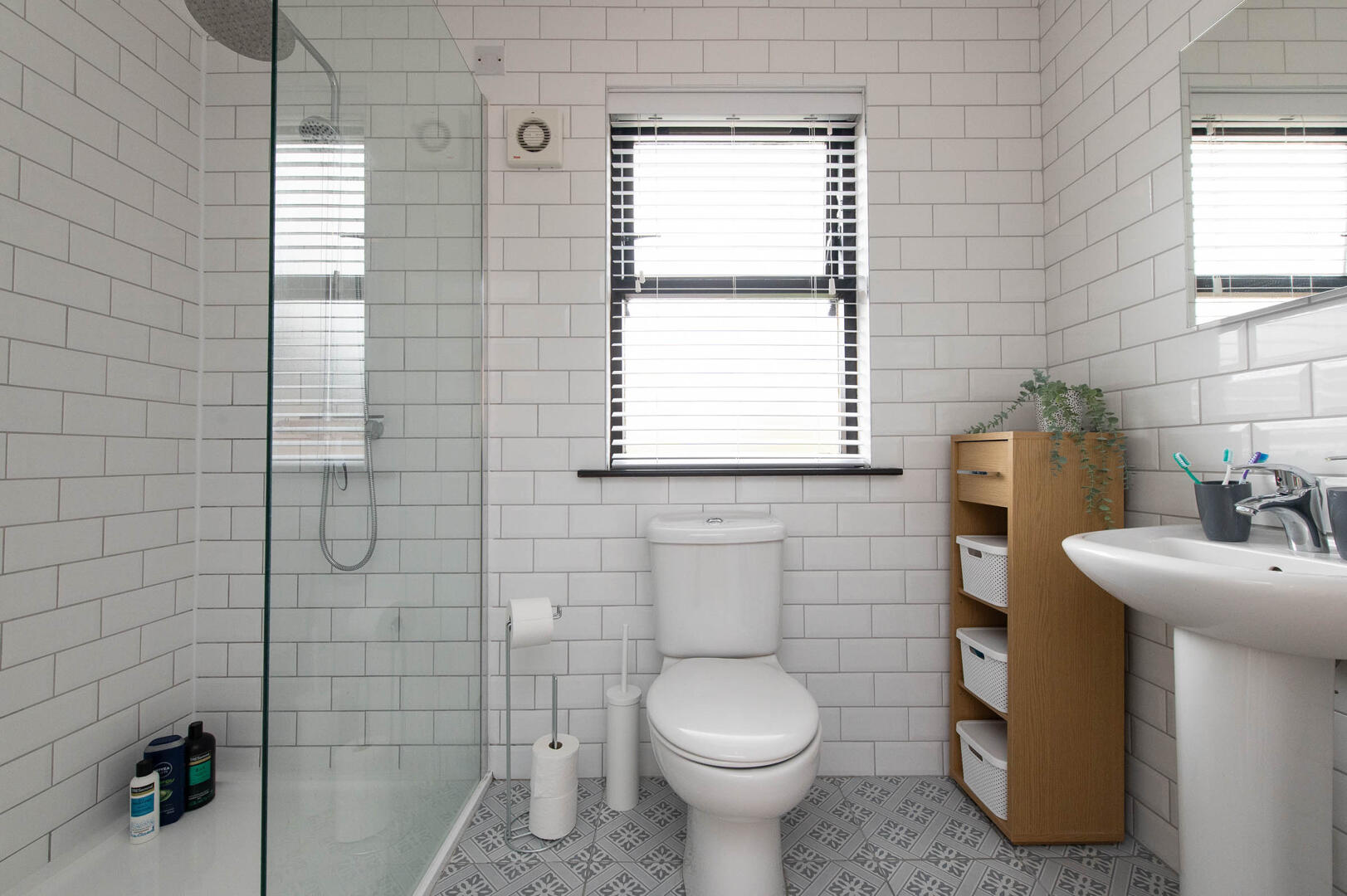 Walk in glazed shower area with thermostatic controlled shower and separate handheld shower, low flush W/C, pedestal wash hand basin, chrome heated towel rail, extractor fan, wall tiling, ceramic tiled flooring