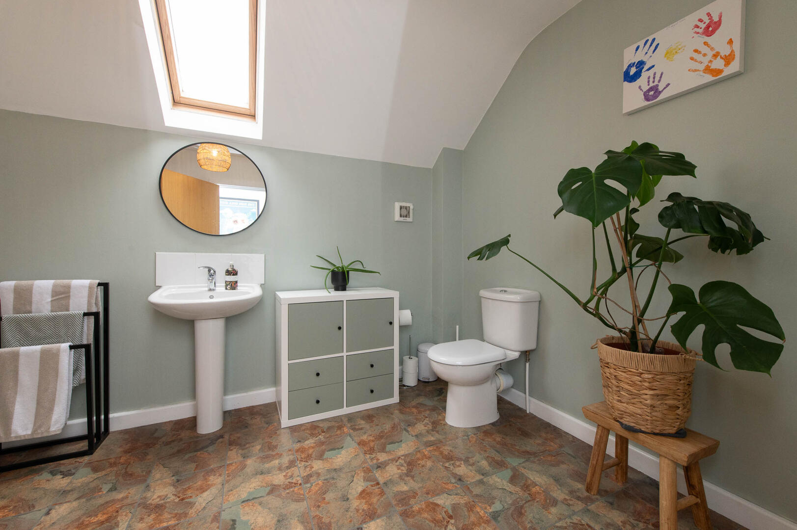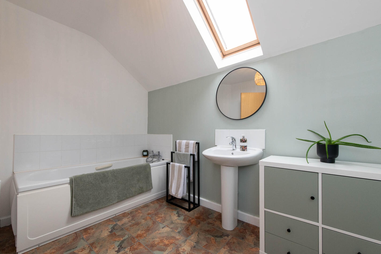 White suite comprising panelled bath, telephone handheld shower, low flush W/C, pedestal wash hand basin, extractor fan, Velux window