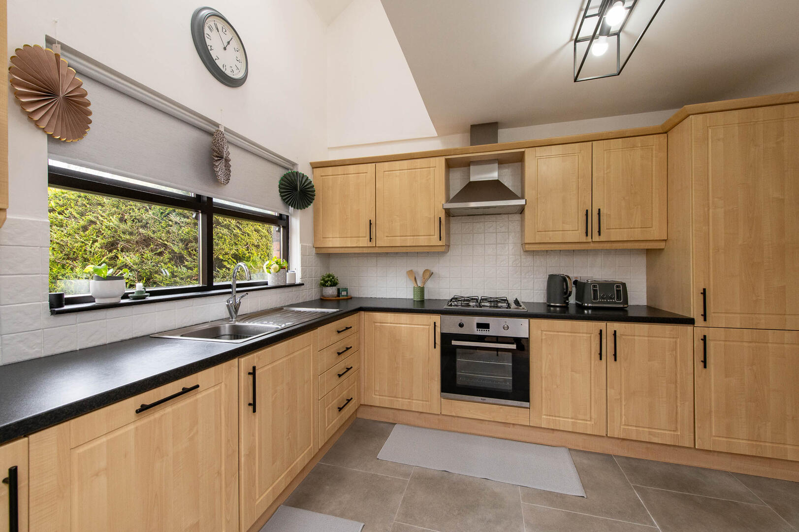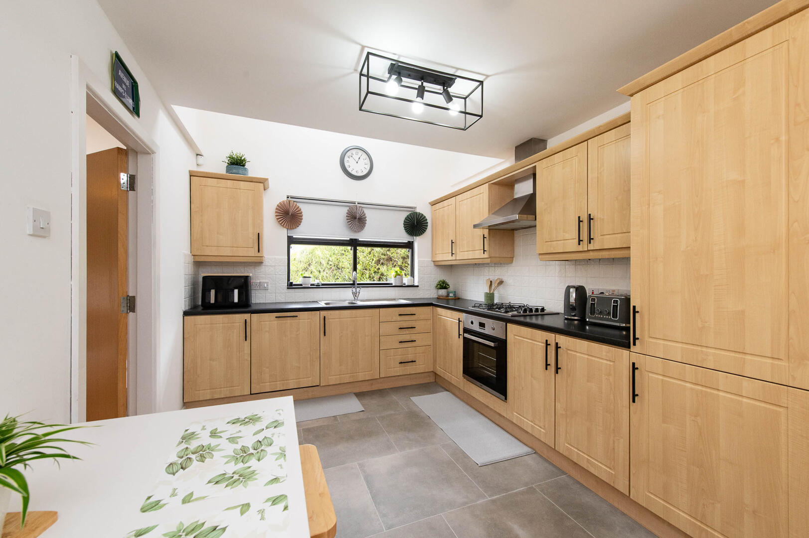 Range of high and low level shaker style units, round edge worksurfaces, integrated fridge freezer, integrated dishwasher, built in stainless steel oven and gas hob, stainless steel extractor fan and canopy, wall tiling, ceramic tiled flooring, casual dining area, Velux window