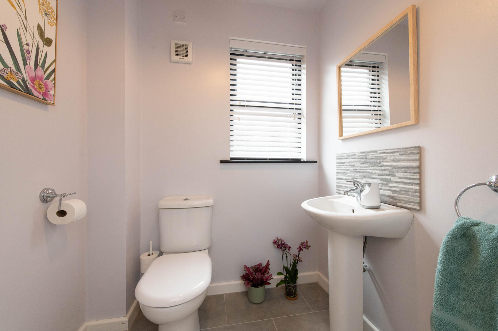 Low flush W/C, tiled splash back, ceramic tiled flooring, extractor fan