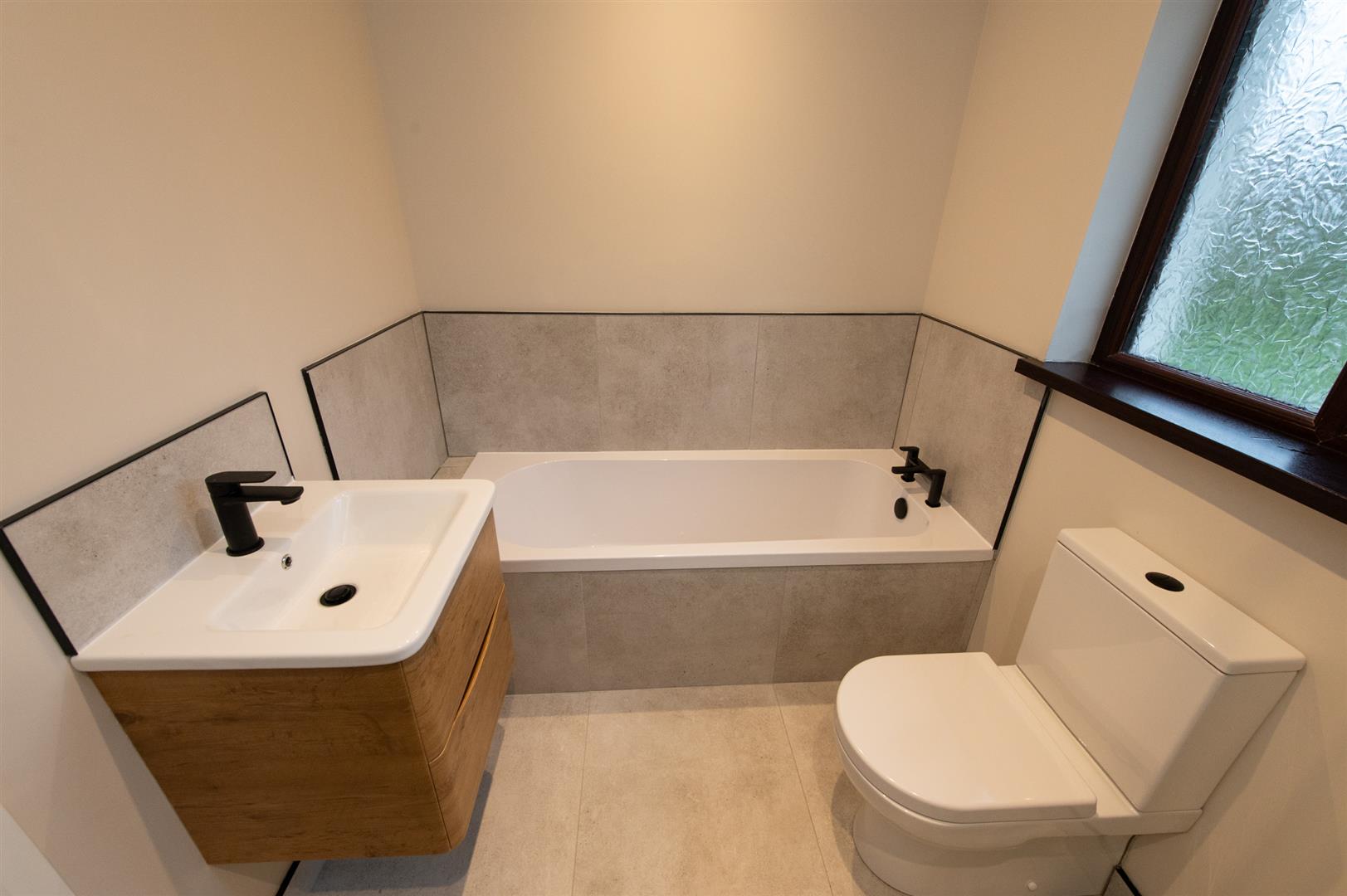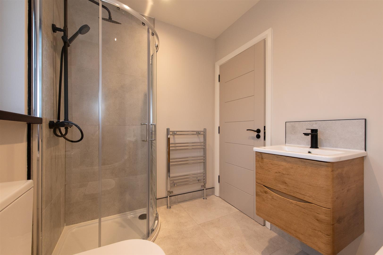 Modern white bathsuite, low flush W/C, wall hung wash hand basin, with twin drawer, built in bath with mixer tap, corner glazed shower unit with rain shower, heated towel rail, ceramic tiled flooring, downlighters