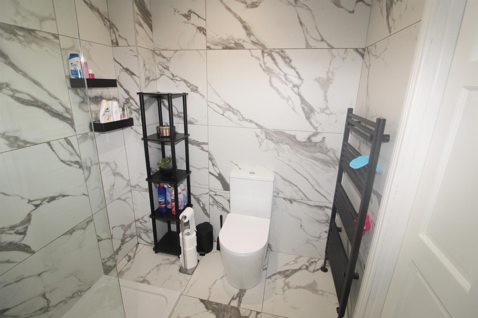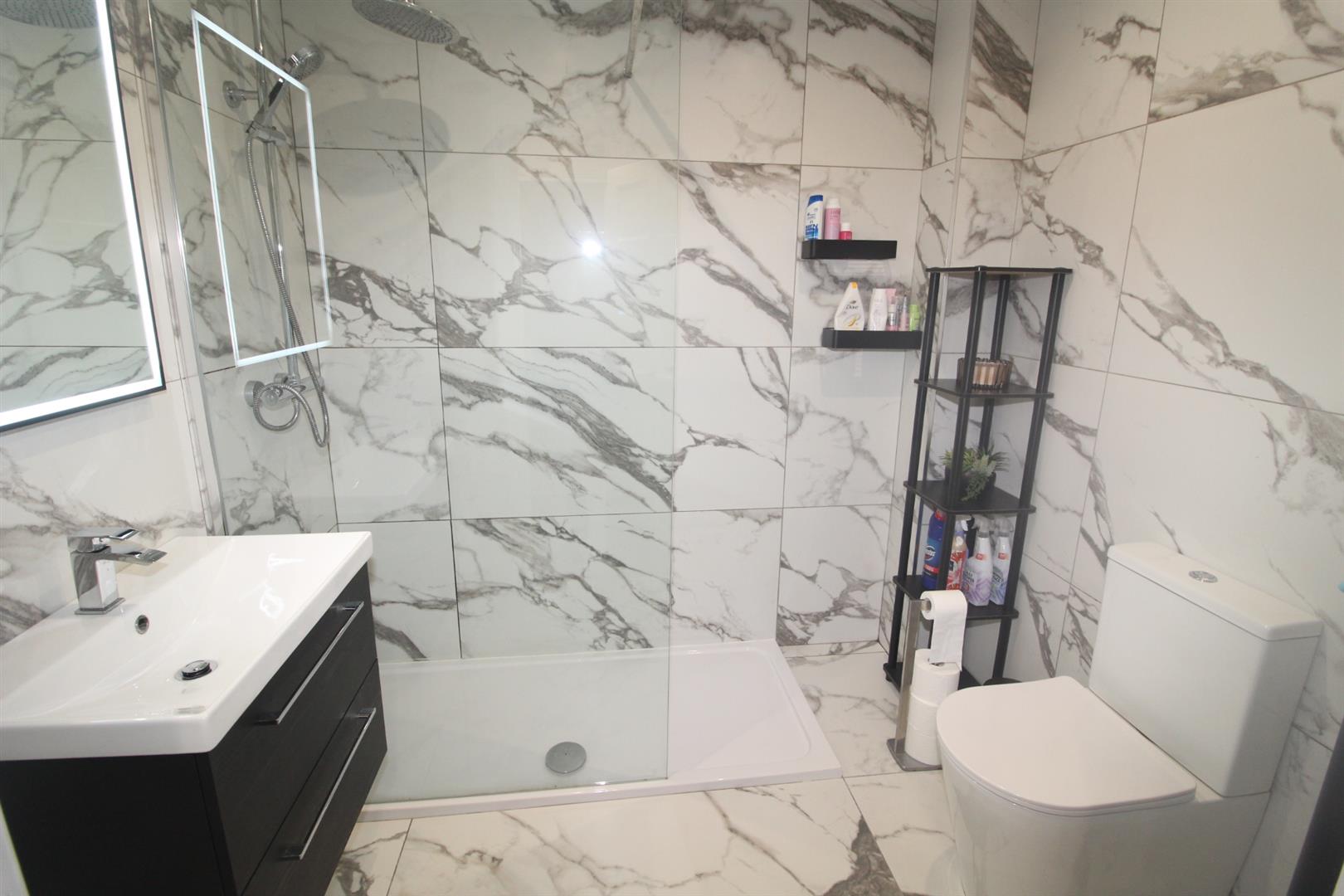 Walk in shower unit with thermostatically controlled shower and rainwater affect shower head, glazed shower screen, floating vanity sink unit with mixer taps, low flush W/C, luxurious wall and floor tiling throughout, heated towel rail, extractor fan