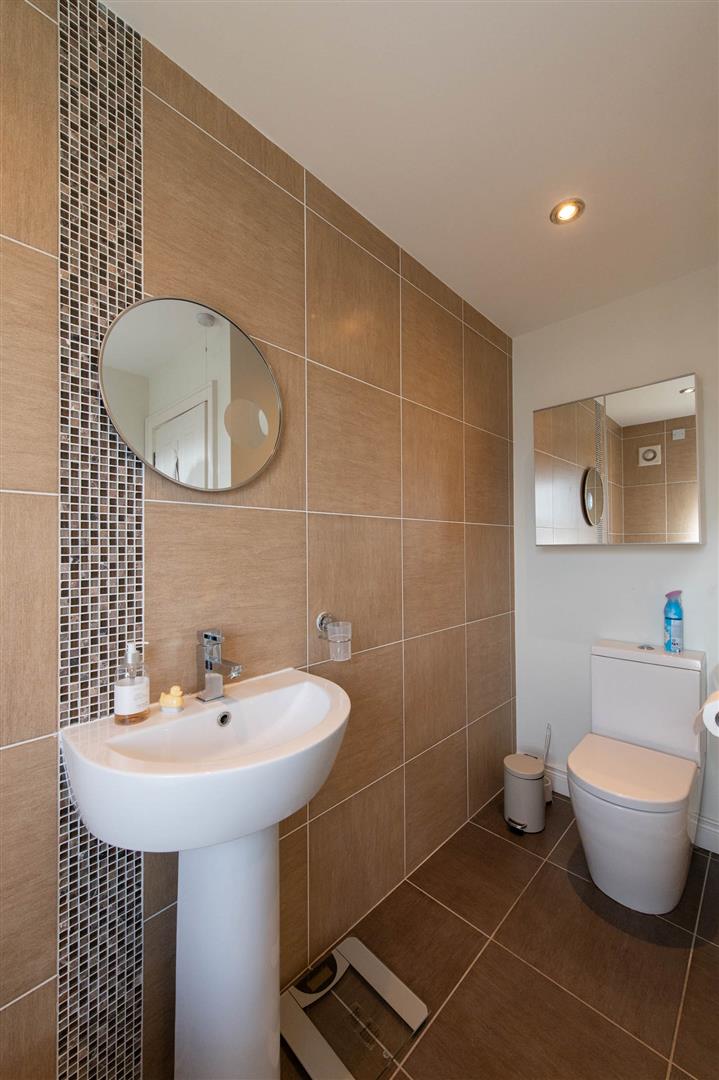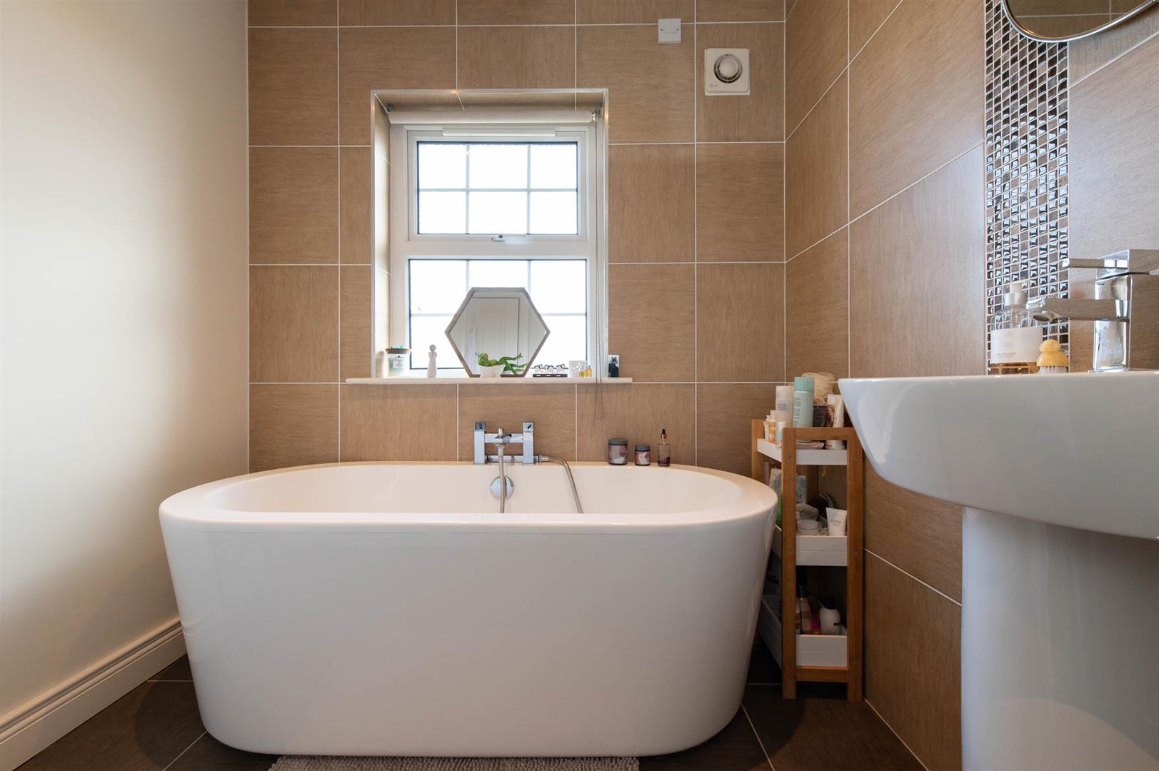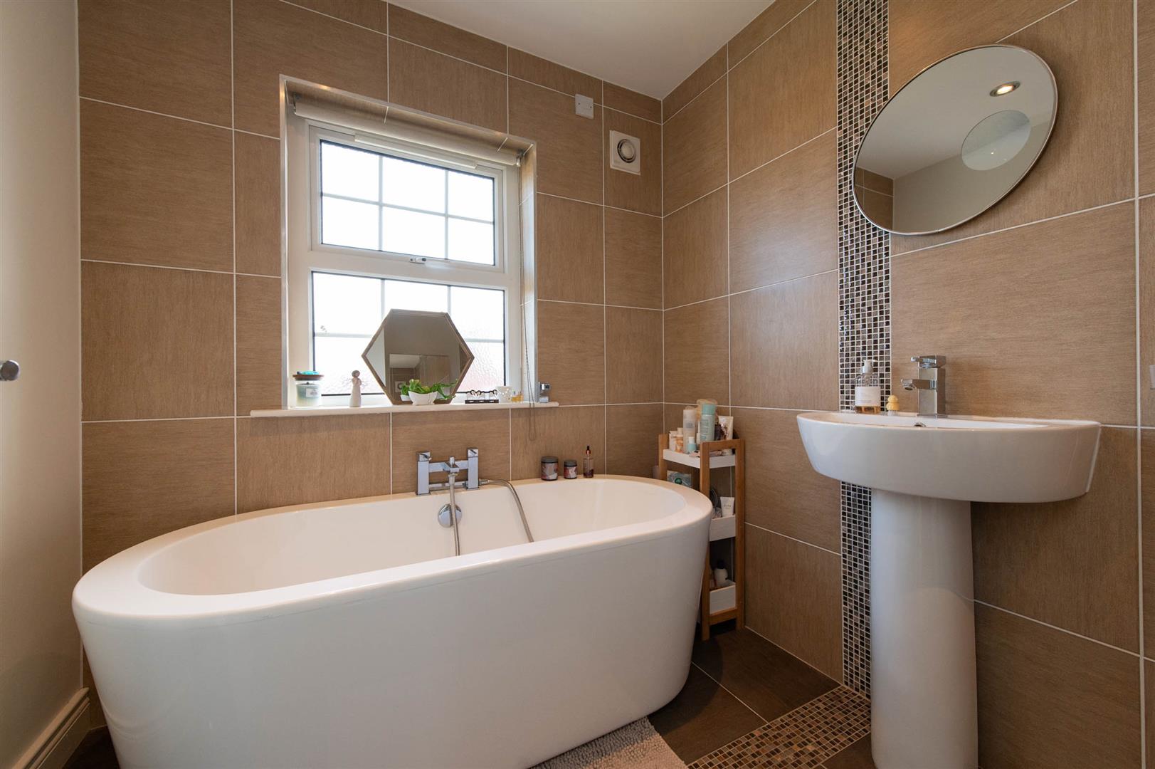 Low flush WC, roll top bath with mixer tap, pedestal wash hand basin, luxury tiling, ceramic tile flooring, downlighters
