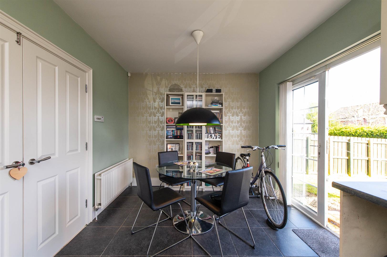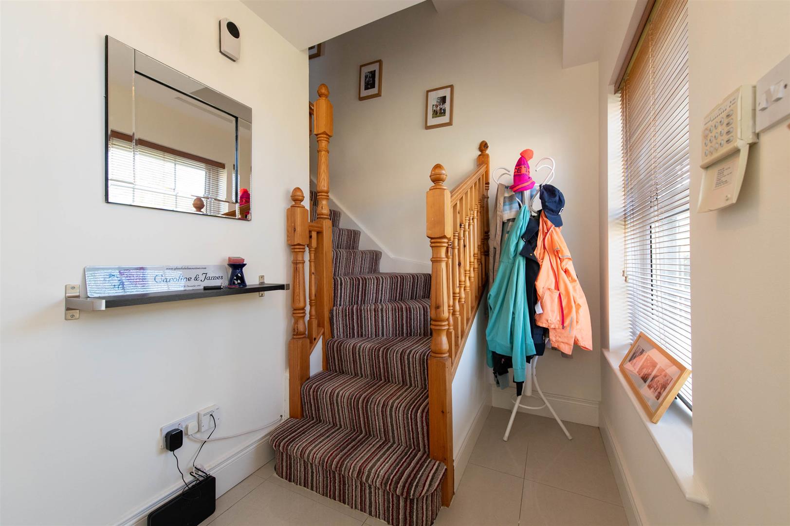 Polished tiled floor, downlighters, feature fireplace, gas fire, understairs storage