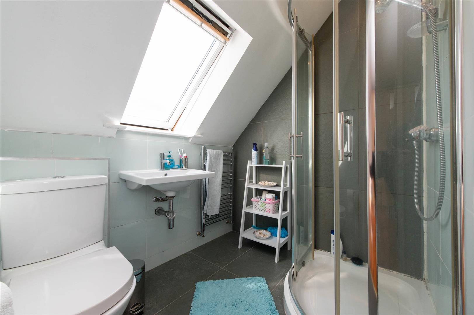 Low flush WC, wash hand basin, corner glazed shower unit with controlled shower, tiling, ceramic tiled flooring, view
