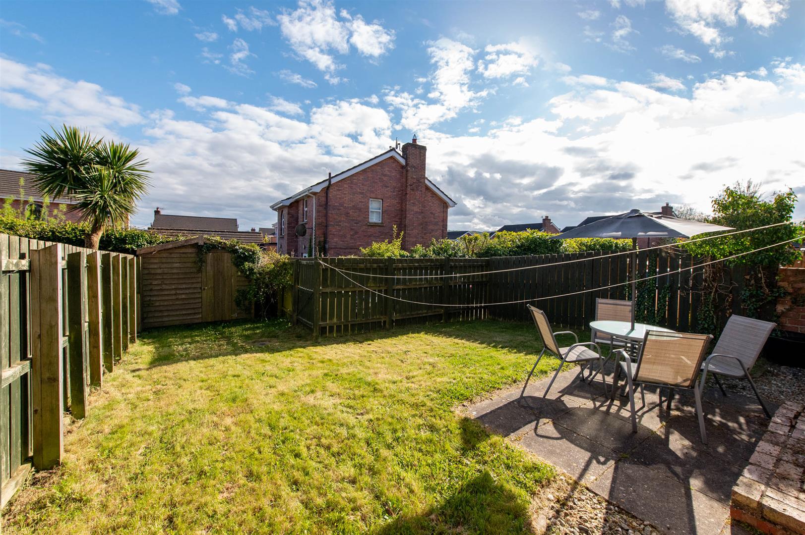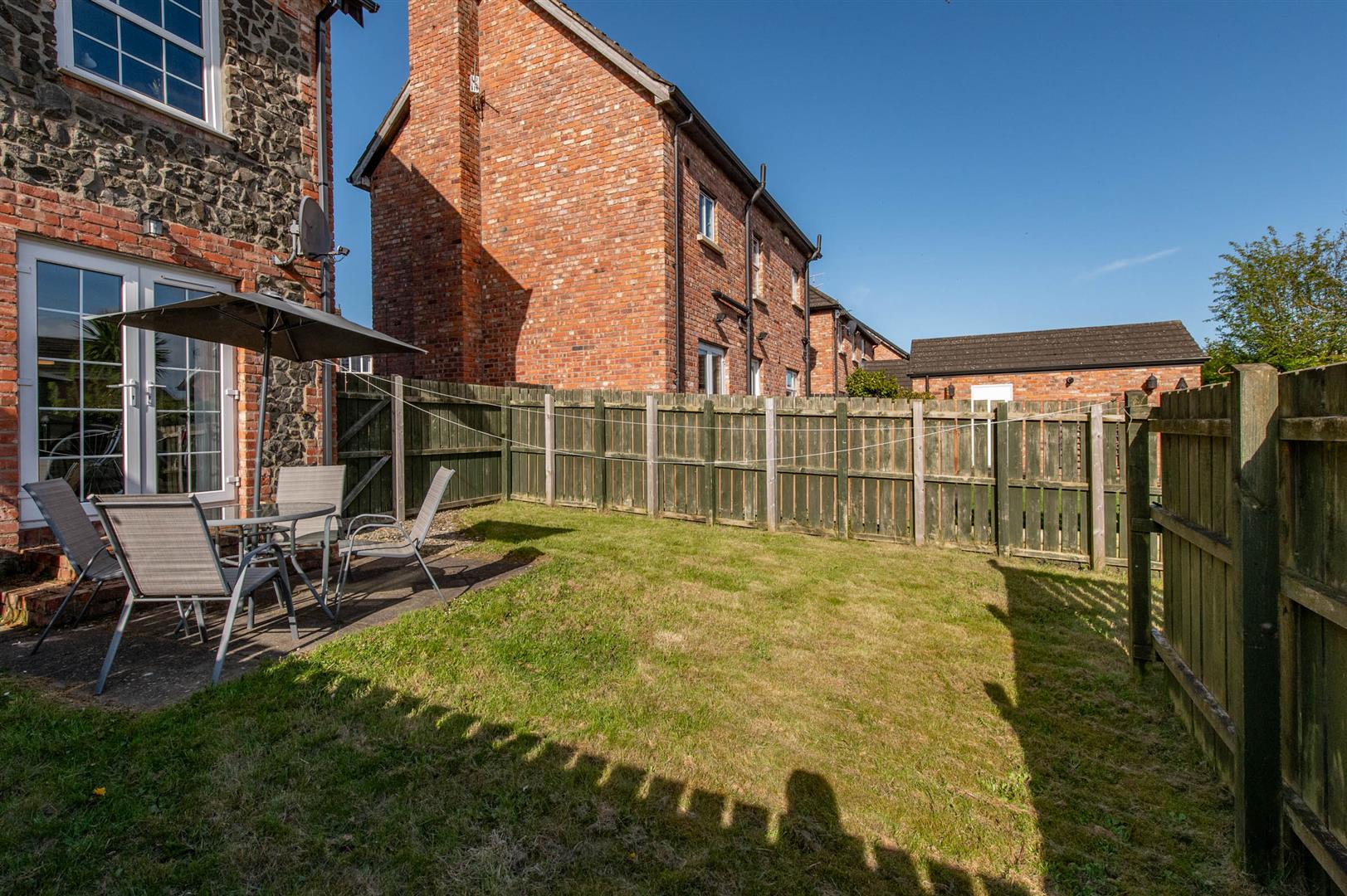 Rear in lawn, paved patio area