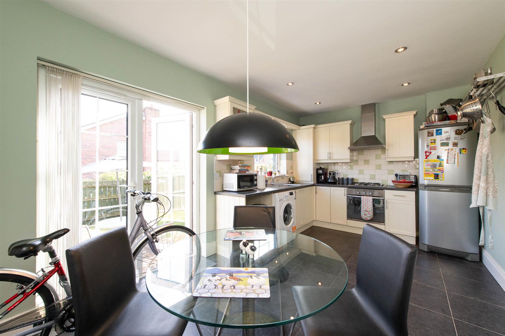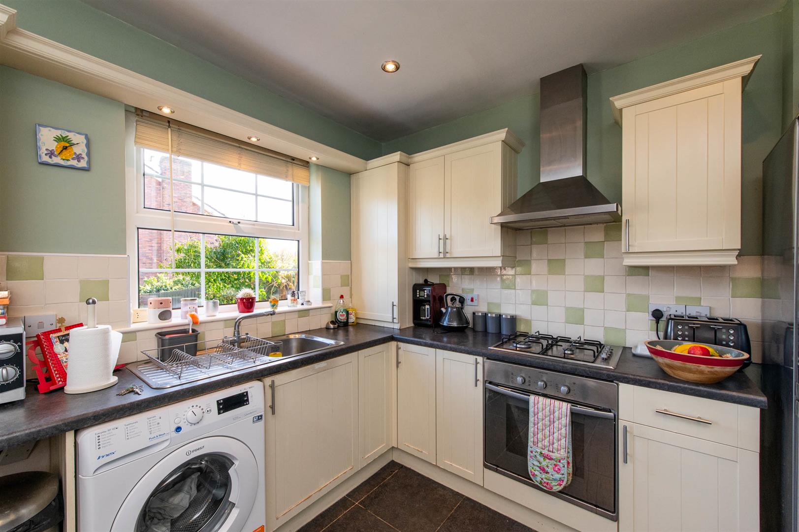 Modern fitted kitchen with range of high and low level units, round edge worksurfaces, stainless steel sink unit with mixer taps, built in gas hob, built in fan assisted oven, stainless steel extractor fan, tiling, gas boiler, plumbed for washing machine, ceramic tiled flooring, French doors to rear