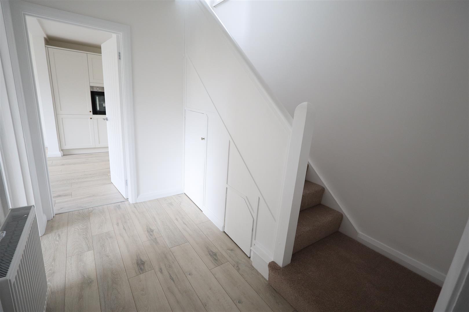 Laminate wooden flooring, understair storage with gas boiler, cloakroom