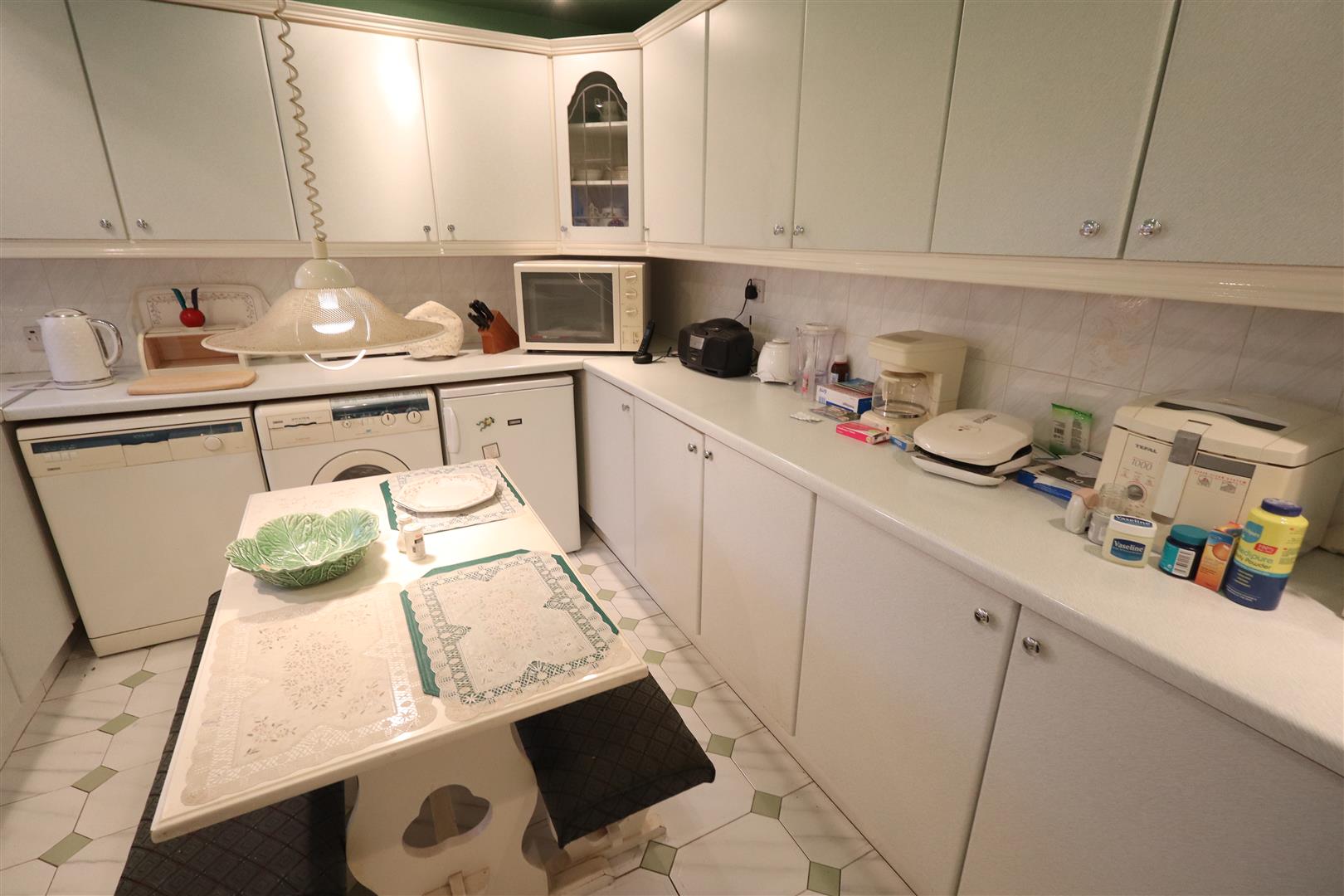 Range of high and low level units, round edge worksurfaces, single drainer stainless steel sink unit with mixer tap, built in oven, inlaid hob, extractor hood, wall tiling, ceramic tiled flooring, space for fridge freezer, plumbed for washing machine, space for dishwasher, downlighters, glass display cabinet