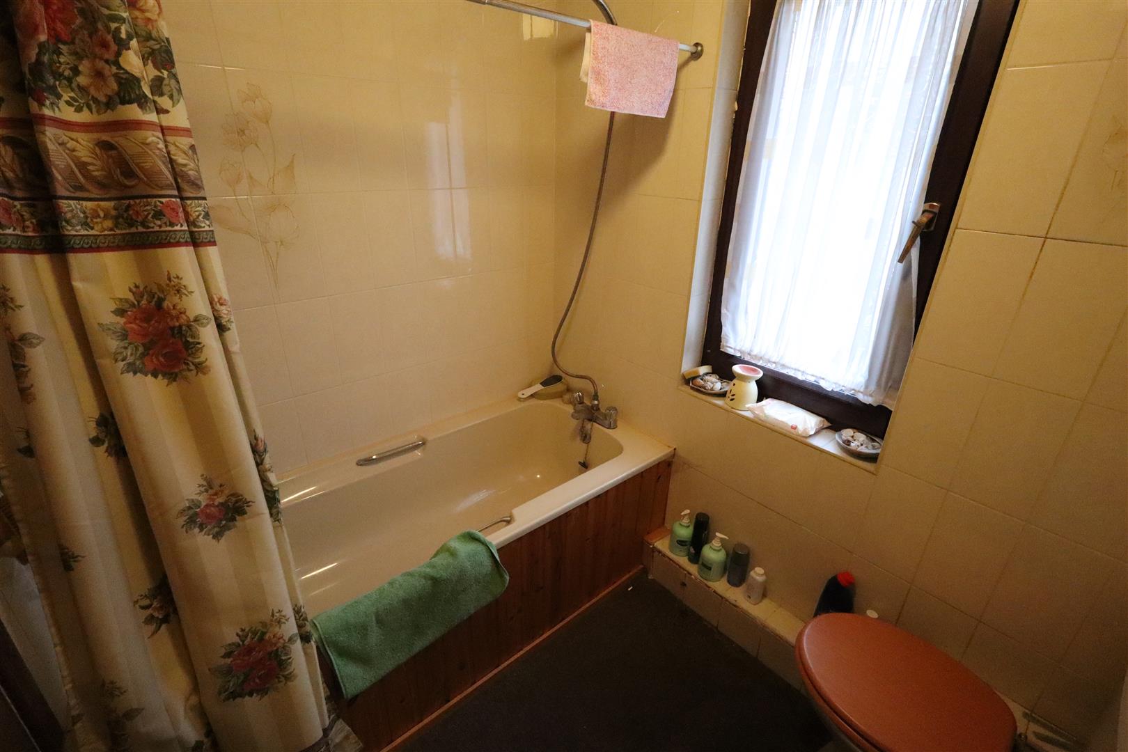 Panelled bath unit, controlled shower, low flush W/C, wall tiling, pedestal wash hand basin