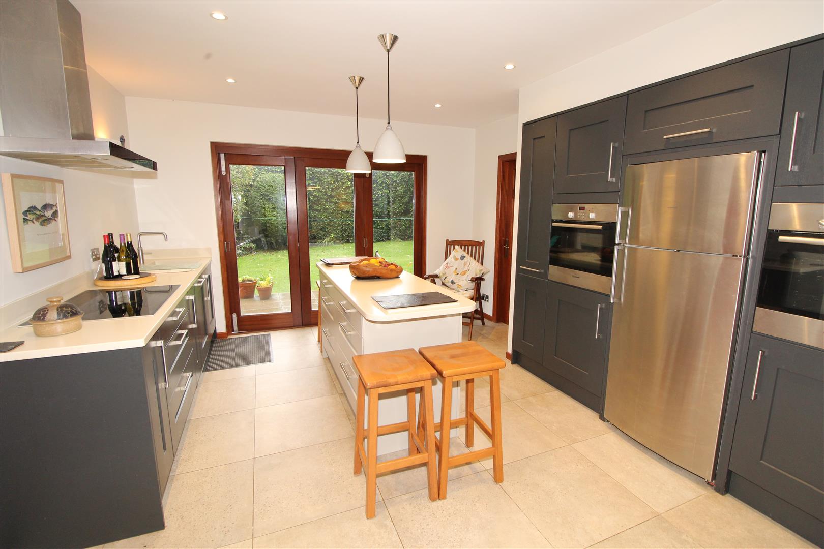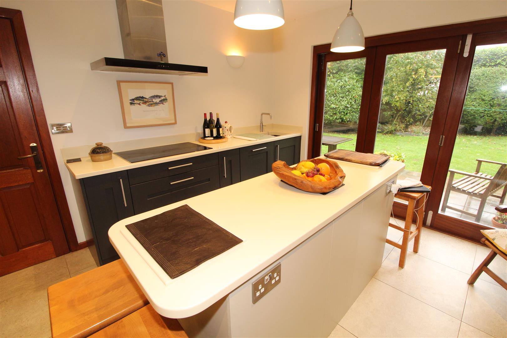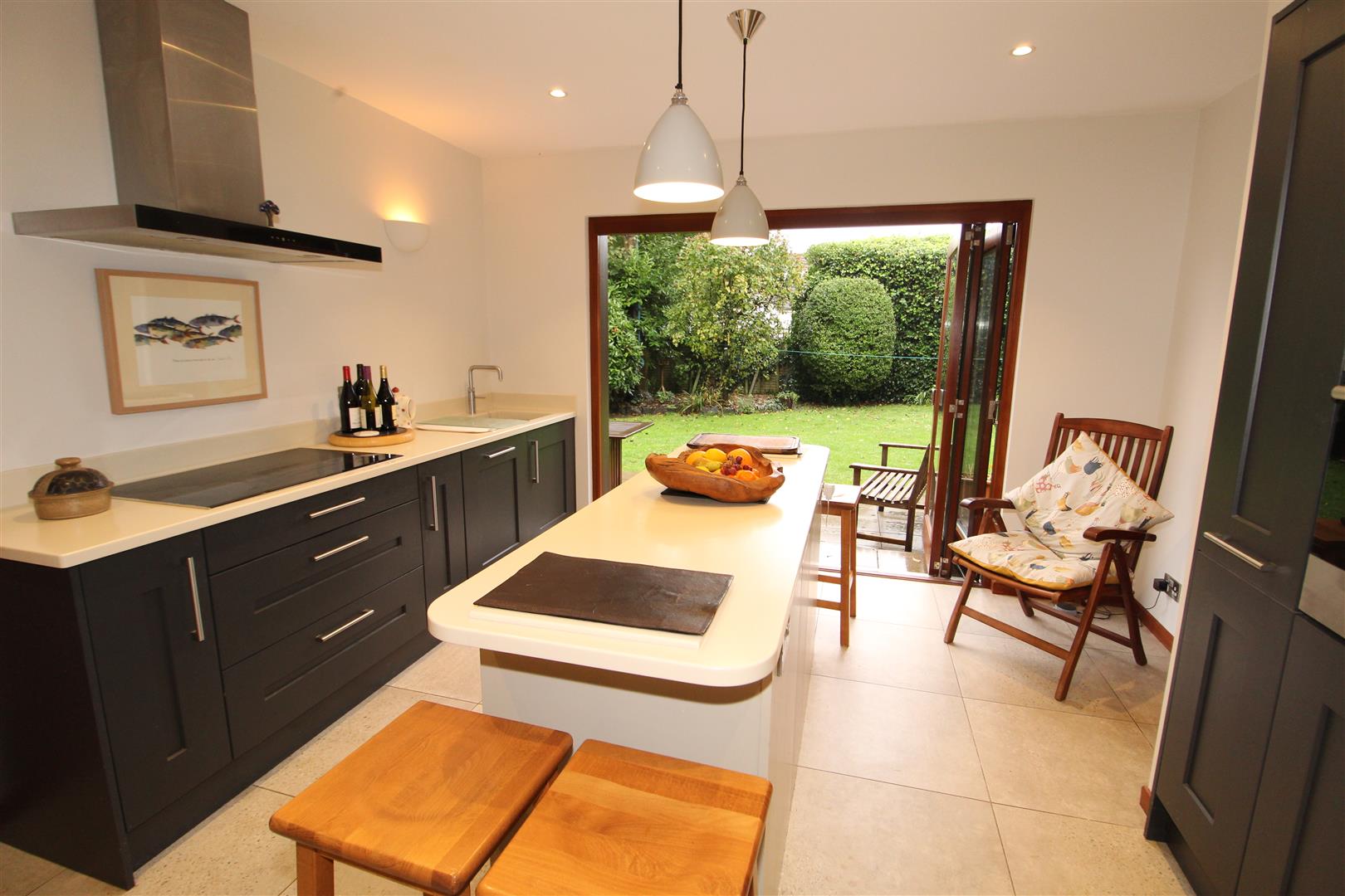 Modern fitted kitchen with bifolding doors to rear, open plan to dining area, patio doors to front